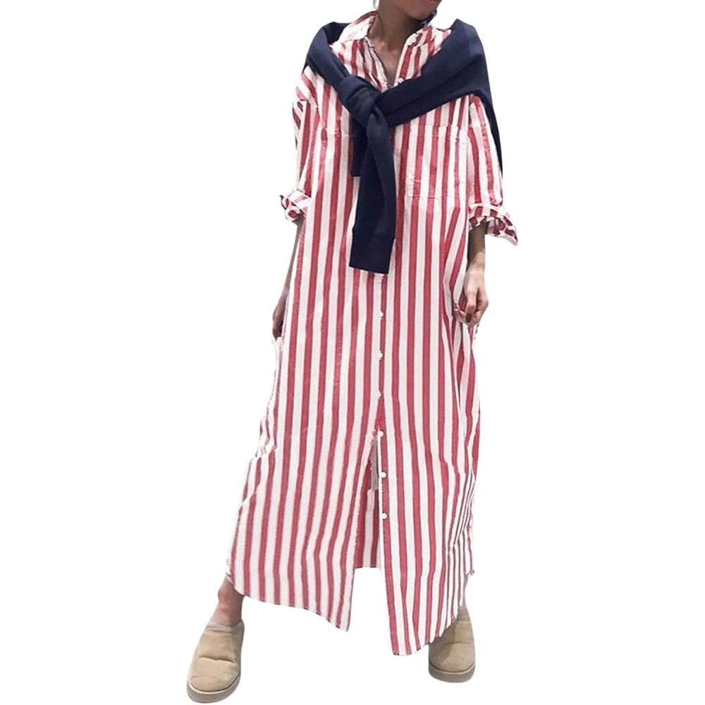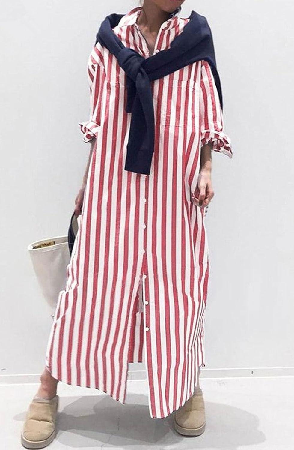 CHARTOU Women Casual Striped Shirt Dress Button Down Long Sleeve Kaftan Long Flowy Dress Cardigan Kimono Shift Dress(Red)