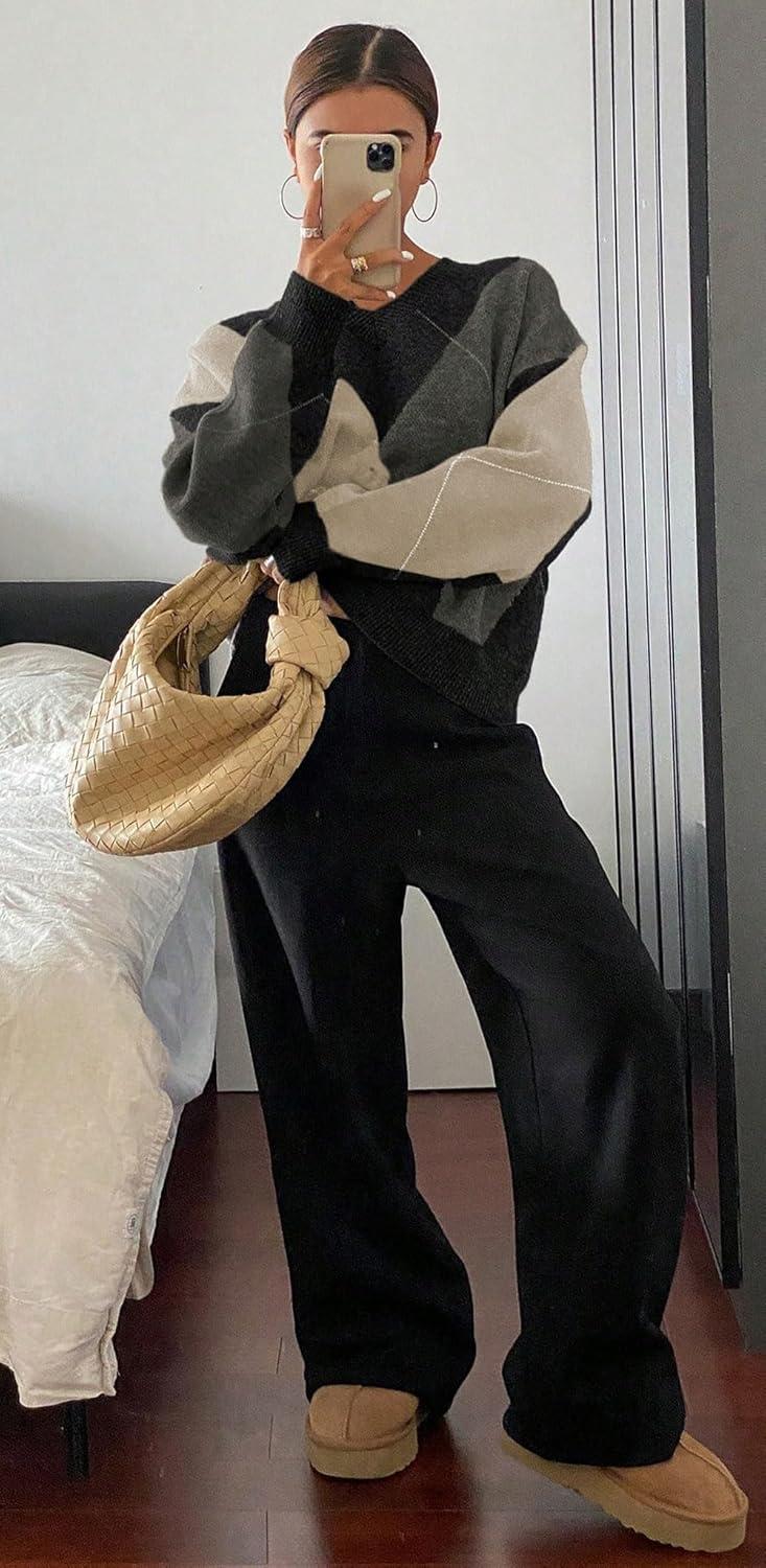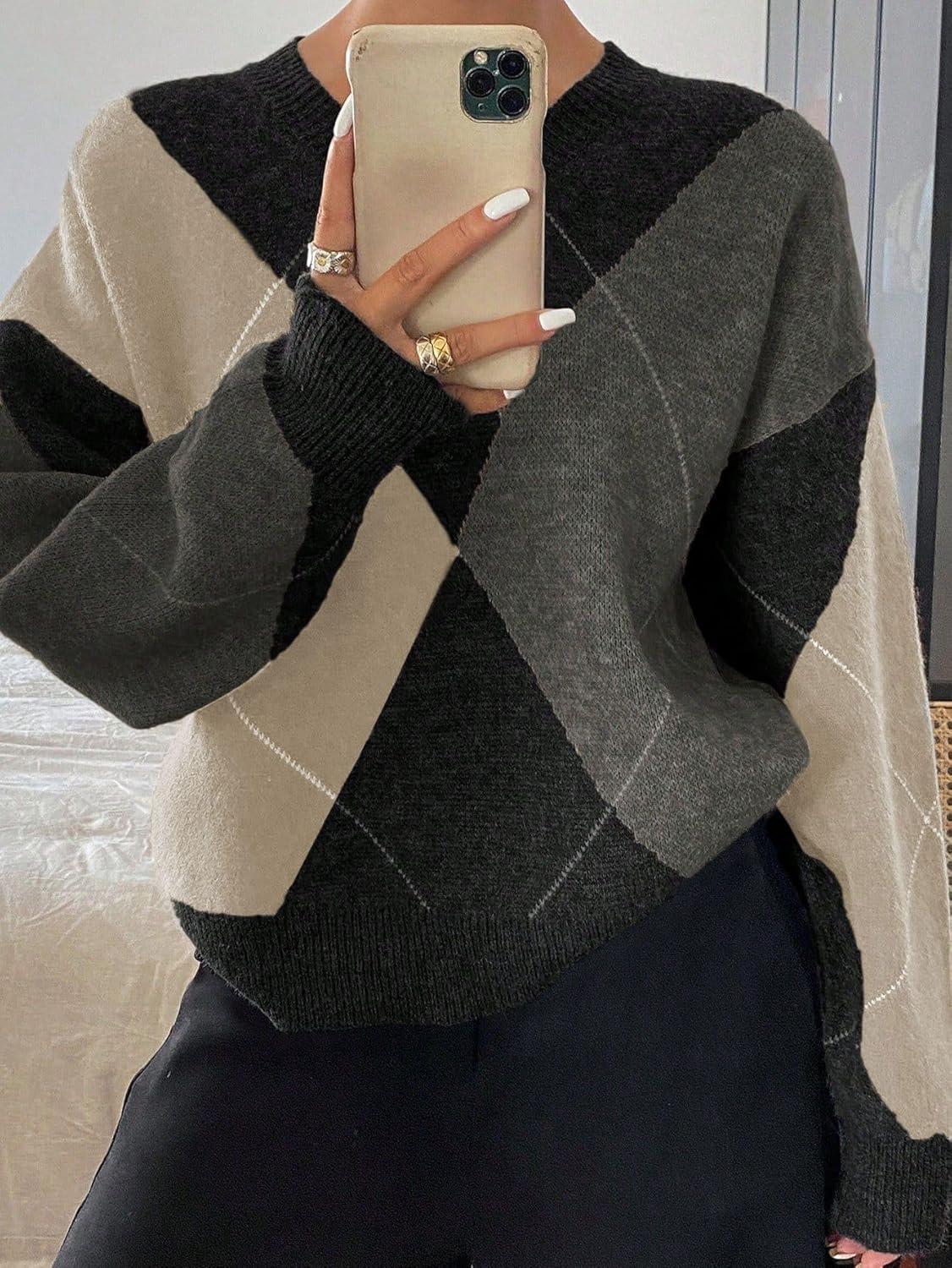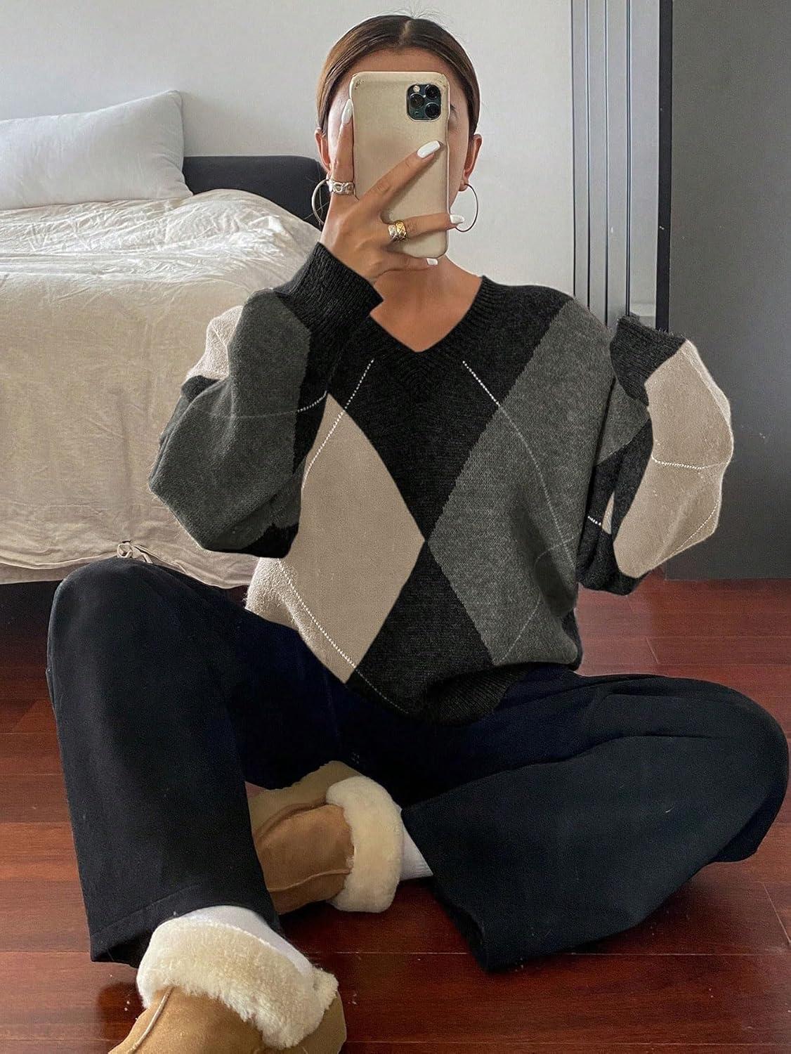 Women Causal V Neck Pullover Sweater y2k Argyle Plaid Sweater Preppy Style Knitwear Tops/ Argyle plaid pullover sweater/ Y2k preppy style sweater for women/ Casual v neck fall sweater knitwear tops/ Size Tips: : S=US 4-6, M=US 8-10, L=US 12-14, XL=US 16-18, XXL=US 20; Constructed with comfort knitted sweater material, this Argyle Plaid Sweater flexibility to accommodate various body shapes and sizes, effortlessly providing a flattering fit/ Preppy Pullover Sweater: This fall women sweater tops featuring loose-fitting, offer maximum comfort fit all day; Classy winter argyle plaid pattern sweater will never out ot date, casual v neck pullover easy to slip on and off, also effortlessly show your charming collarbone/ Design: Women causal pullover sweater/ V neck long sleeve women knitwear/ Comfort argyle plaid sweater tops/ Y2k preppy plaid sweater tops/ Color block diamond knit sweatshirt top/ Argyle Pullover Sweater: Fall women casual v neck plaid sweater tops/ Comfort loose fit lantern long sleeve knit sweater/ Y2k preppy sweater for women fall fashion outfits/ Brown argyle women fall winter holiday sweater tops/ Lightweight women sweater tops for basic knit tops/ Oversized plaid pullover sweater for women comfort Christmas ugly sweater