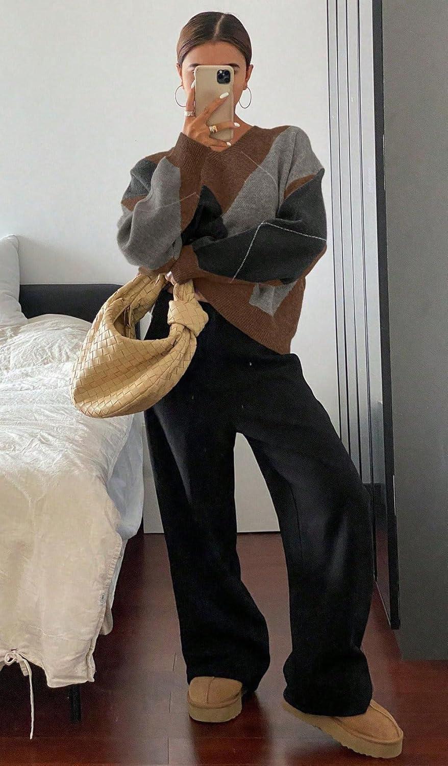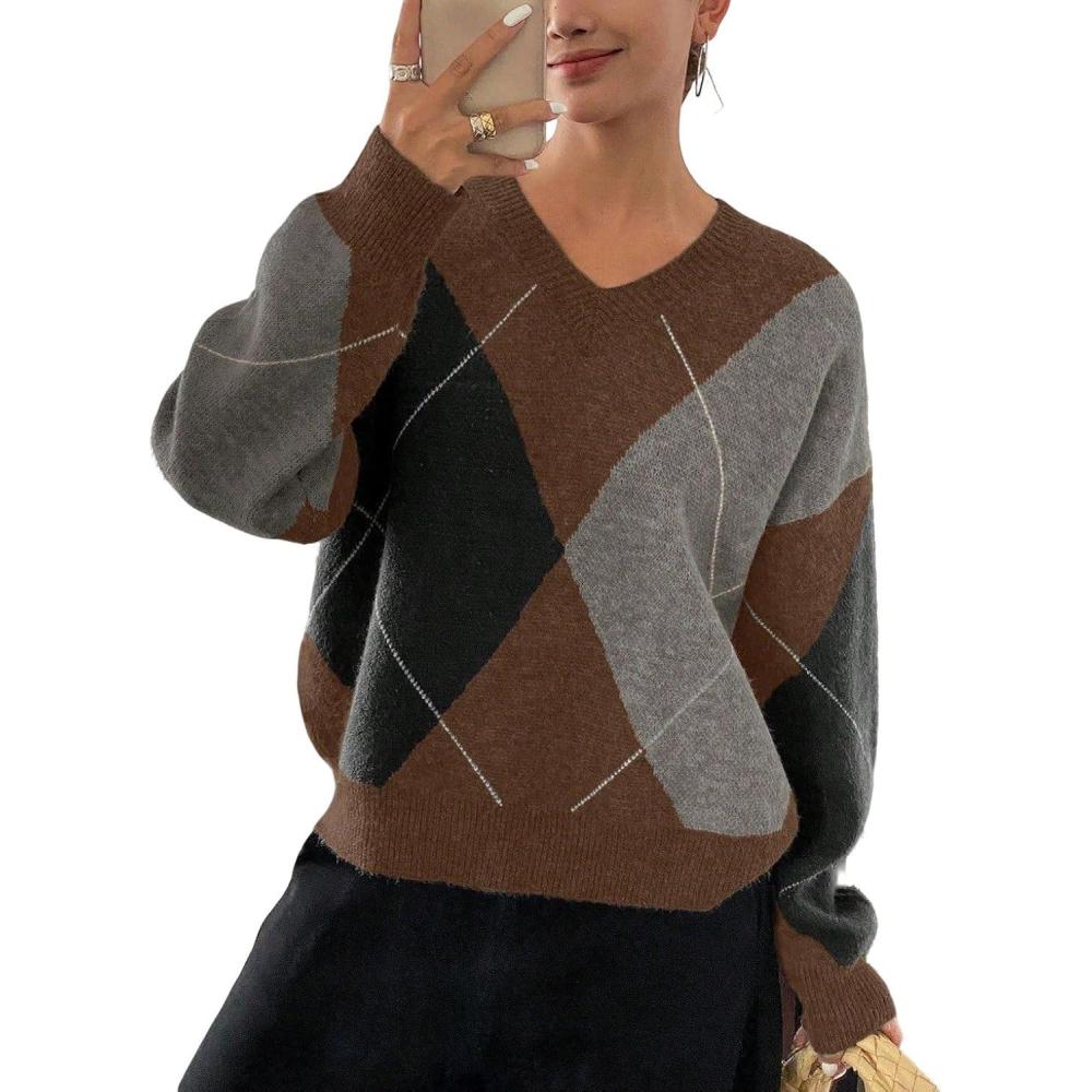 Women Causal V Neck Pullover Sweater y2k Argyle Plaid Sweater Preppy Style Knitwear Tops/ Argyle plaid pullover sweater/ Y2k preppy style sweater for women/ Casual v neck fall sweater knitwear tops/ Size Tips: : S=US 4-6, M=US 8-10, L=US 12-14, XL=US 16-18, XXL=US 20; Constructed with comfort knitted sweater material, this Argyle Plaid Sweater flexibility to accommodate various body shapes and sizes, effortlessly providing a flattering fit/ Preppy Pullover Sweater: This fall women sweater tops featuring loose-fitting, offer maximum comfort fit all day; Classy winter argyle plaid pattern sweater will never out ot date, casual v neck pullover easy to slip on and off, also effortlessly show your charming collarbone/ Design: Women causal pullover sweater/ V neck long sleeve women knitwear/ Comfort argyle plaid sweater tops/ Y2k preppy plaid sweater tops/ Color block diamond knit sweatshirt top/ Argyle Pullover Sweater: Fall women casual v neck plaid sweater tops/ Comfort loose fit lantern long sleeve knit sweater/ Y2k preppy sweater for women fall fashion outfits/ Brown argyle women fall winter holiday sweater tops/ Lightweight women sweater tops for basic knit tops/ Oversized plaid pullover sweater for women comfort Christmas ugly sweater