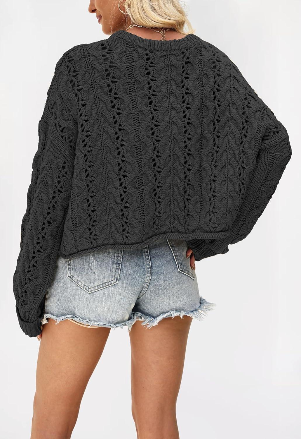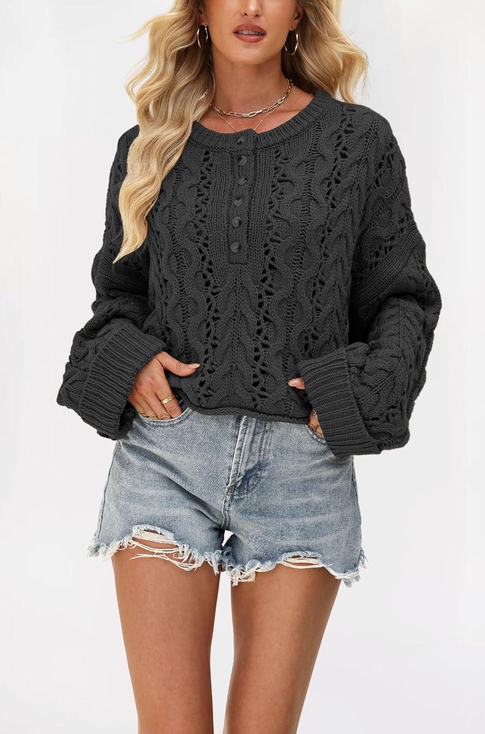 CHARTOU Women Chunky Cable Crop Sweater Pullover Casual Half Button Flared Long Sleeve Jumper Tops(Black)
