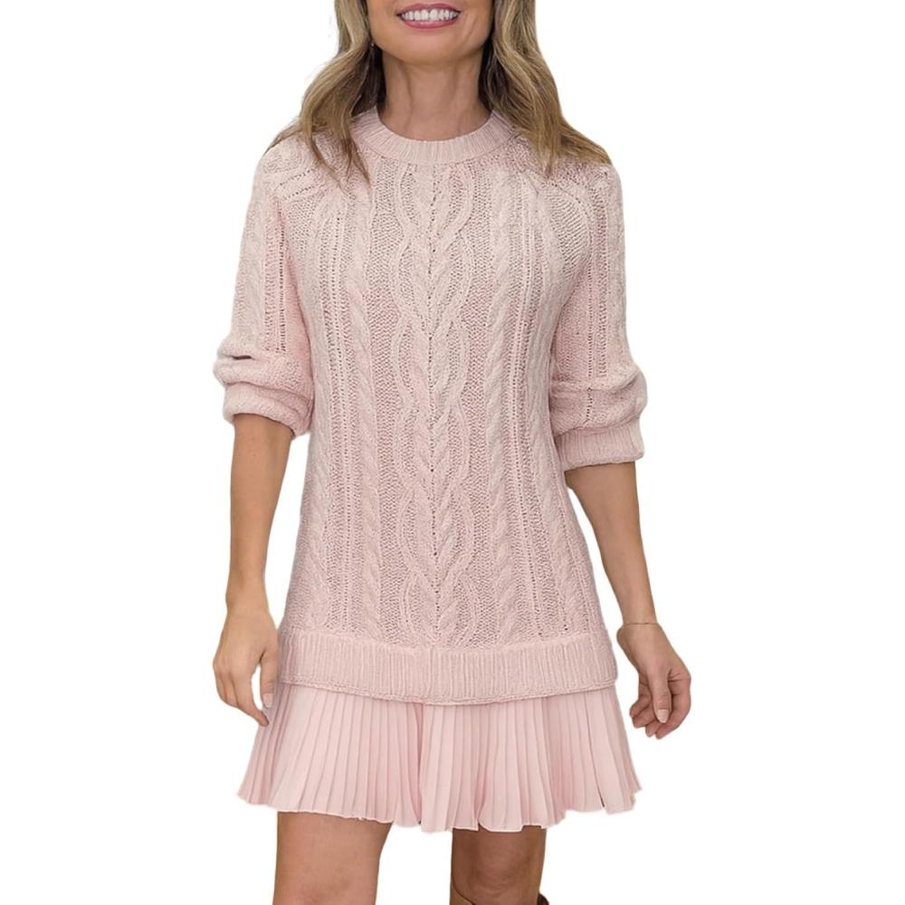 CHARTOU Women Chunky Cable Pullover Sweater Dress Fall Winter Lace Patchwork Long Sleeve Jumper Knit Sweater(Pink)