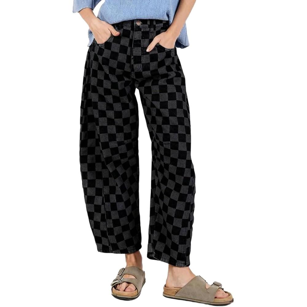 CHARTOU Women Contrast Checkered Barrel Jeans Baggy Wide Leg Denim Pants Cropped High Waist Y2k Sweatpants(Black)