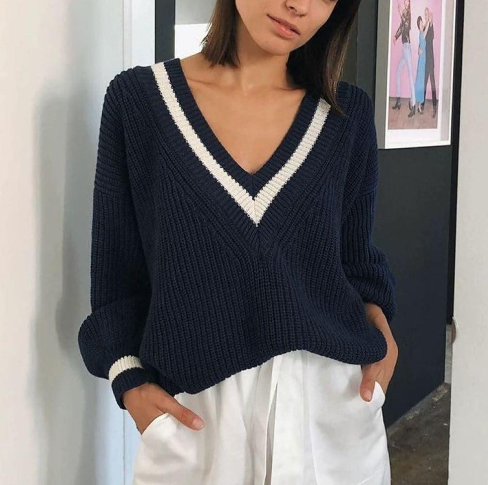 CHARTOU Women Contrast Color Knitted Sweater/ Oversized Casual Loose Fit Winter Sweater/ 2025 Fall Outfits Jumper Tops/ V Neck Long Sleeve Knit Jumper Tops