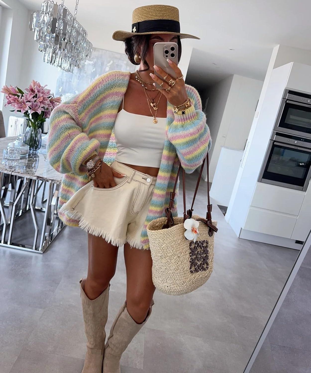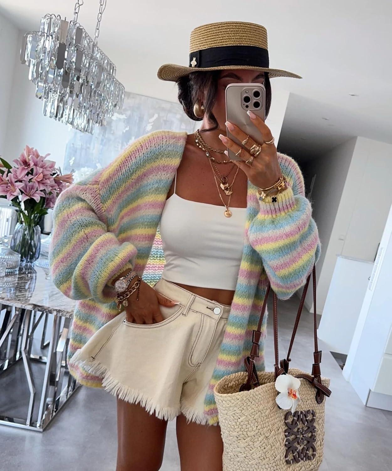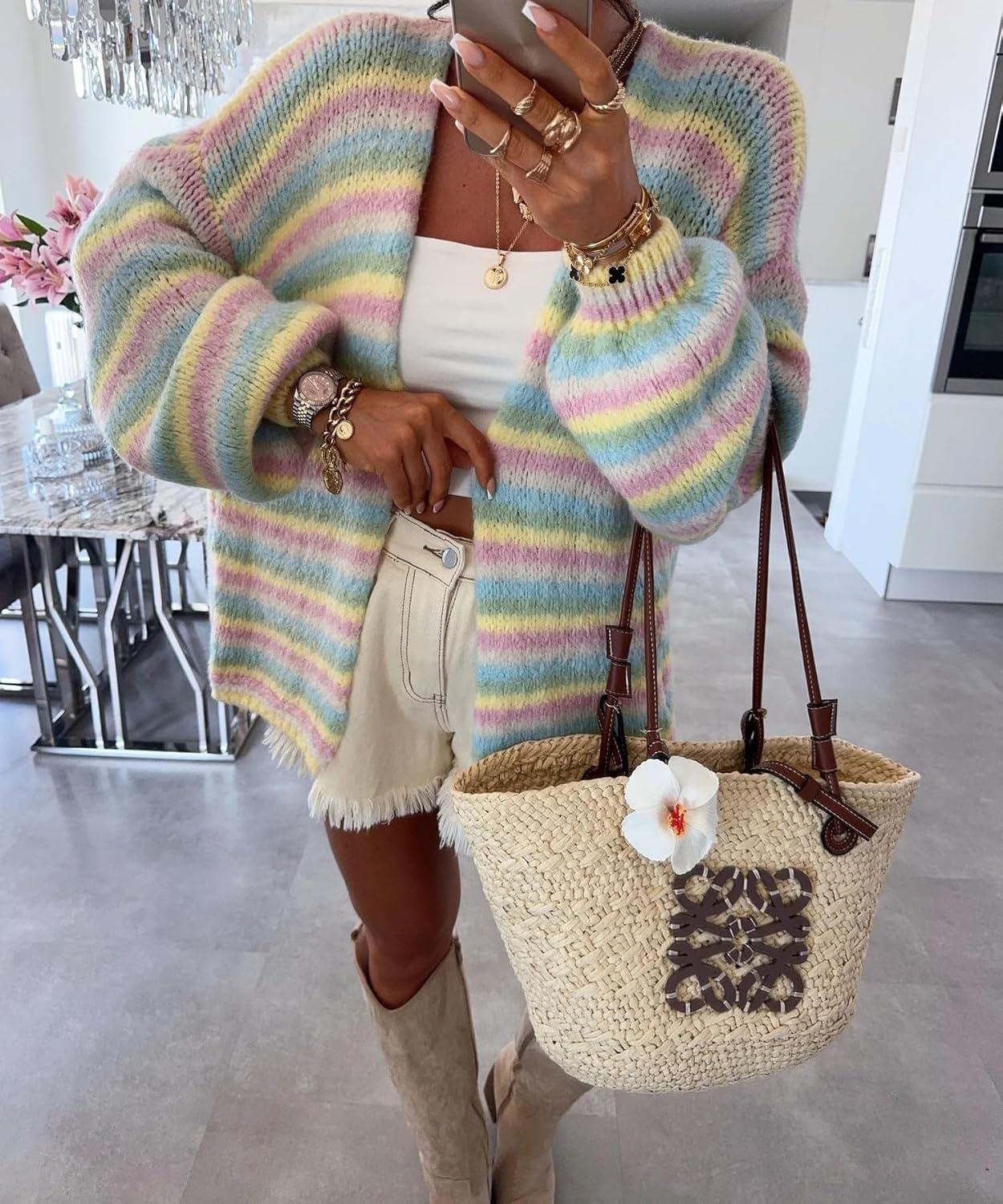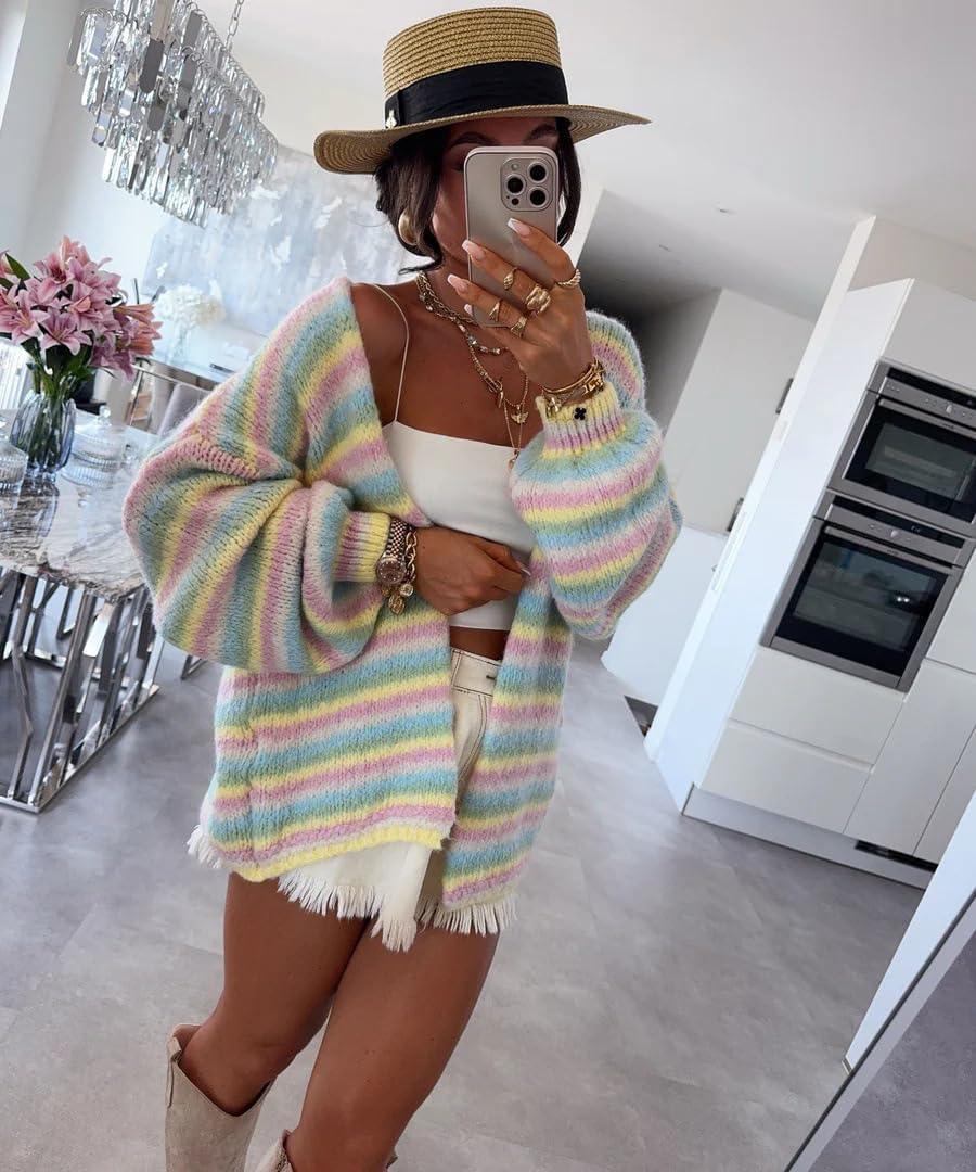 CHARTOU Women Contrast Color Striped Cardigan Sweater/ Slouchy Oversized Knit Sweater Jacket/ Long Sleeve Fuzzy Knitwear Jumper Tops/ Color Block Women Trendy 2025 Fall Winter Vacation Outfits/ Rainbow Stripes Cardigan Top