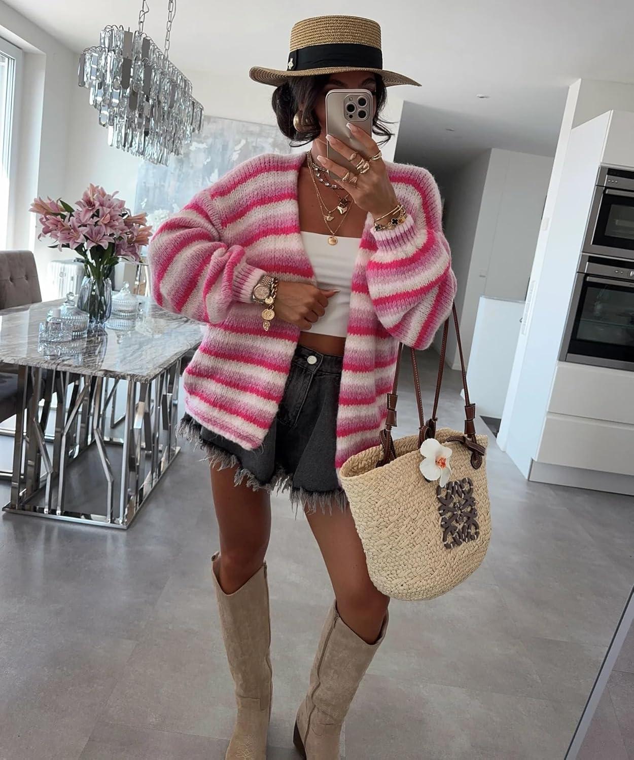 CHARTOU Women Contrast Color Striped Cardigan Sweater Fall Oversized Slouchy Open Front Knit Sweater Jacket(Pink)