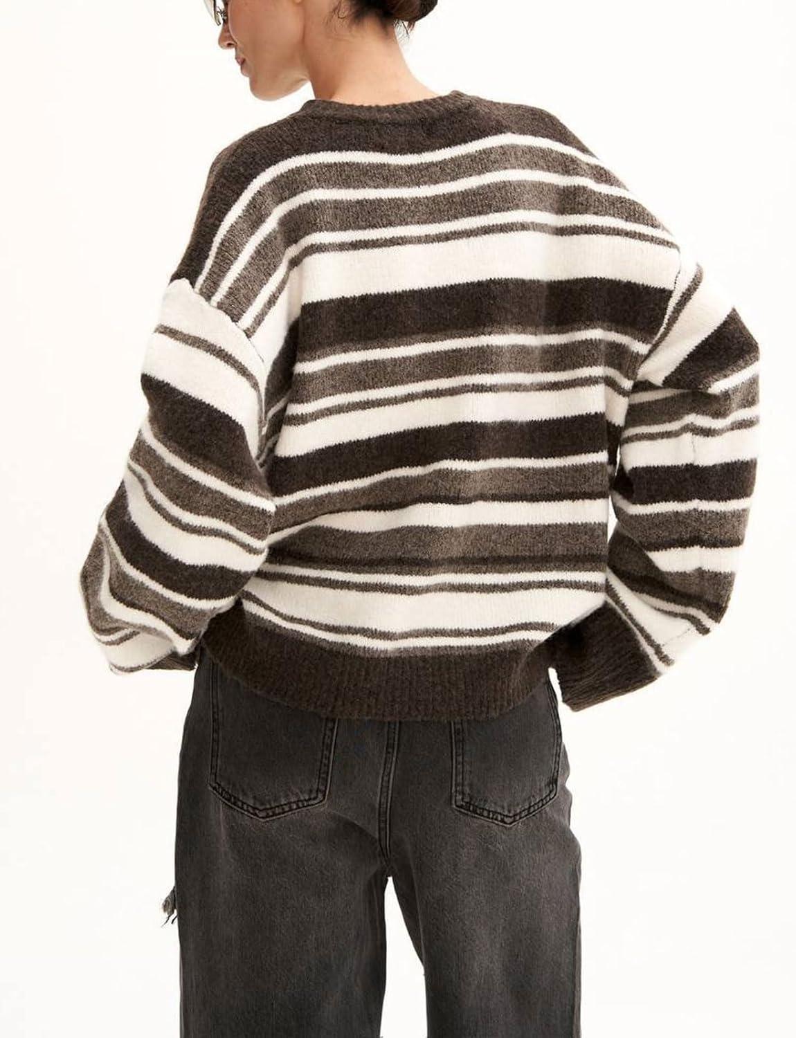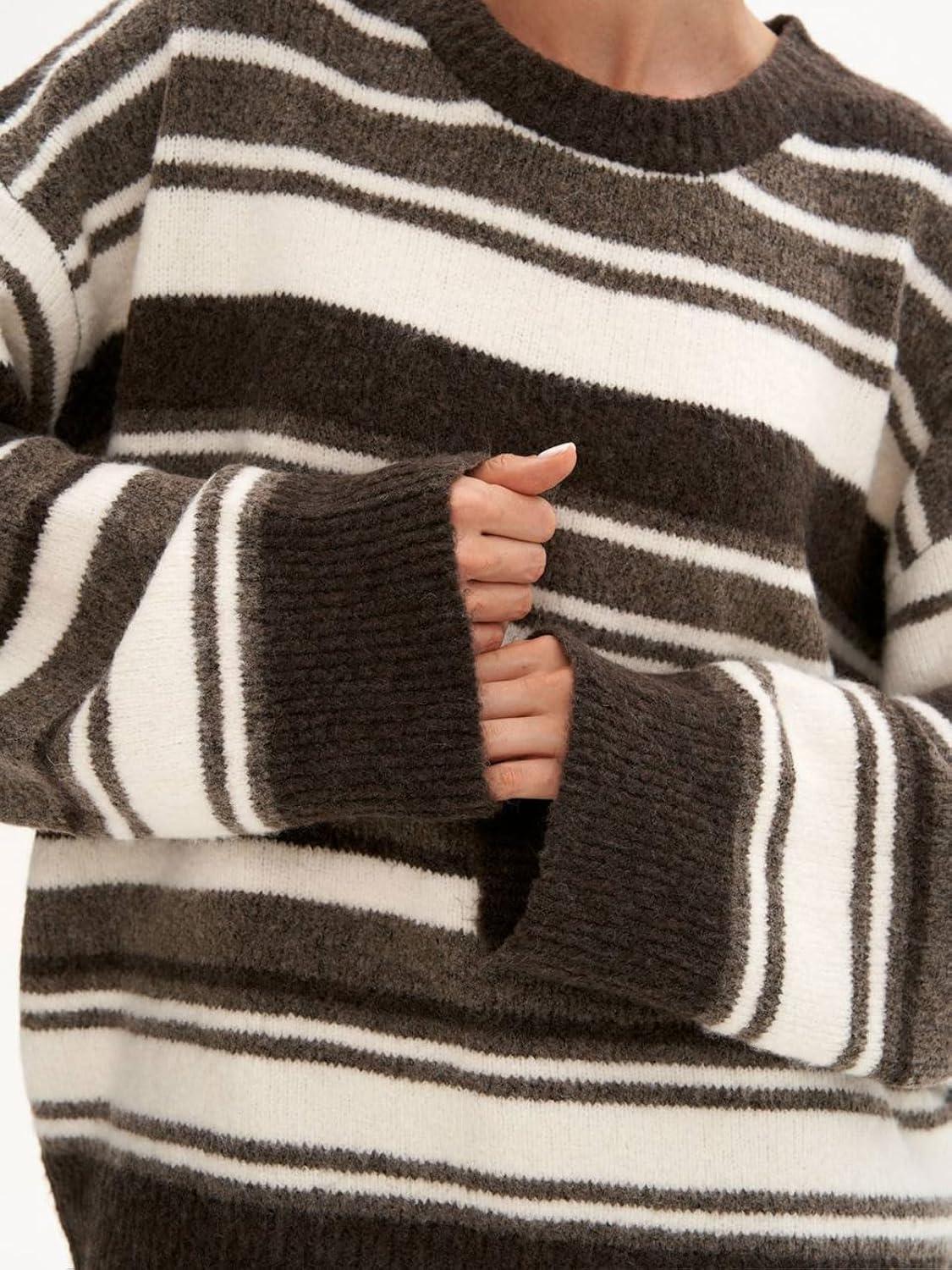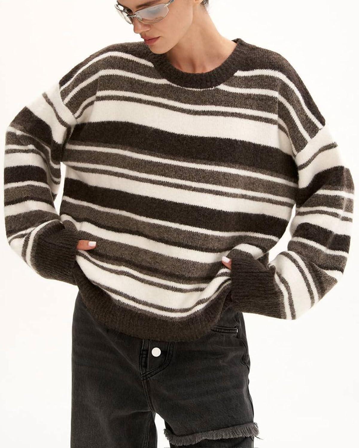 CHARTOU Women Contrast Striped Oversized Sweater Fall Fashion Knitted Pullover Sweater Crewneck Cute Tops(Brown)