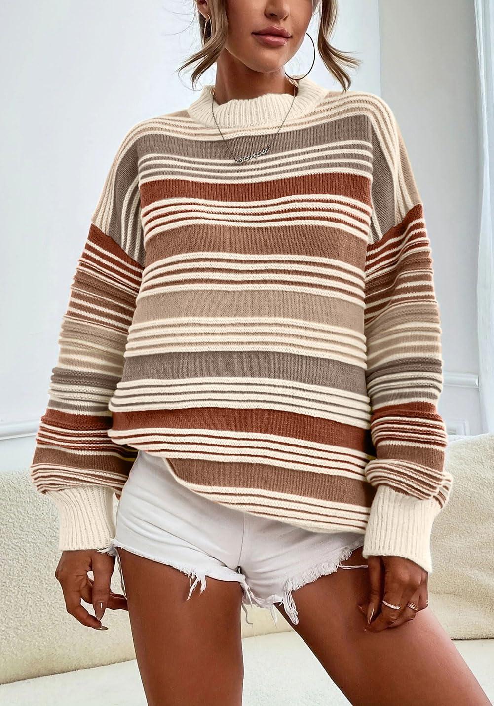 CHARTOU Women Contrast Striped Pullover Sweater 2025 Fall Outfits Oversized Knit Jumper Tops(Brown)