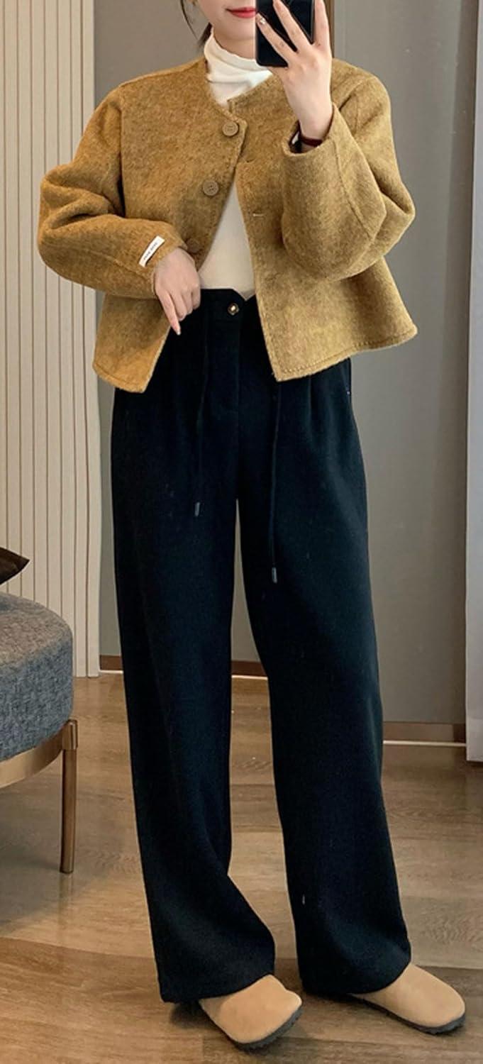 CHARTOU Women Crop Pea Coat Dressy Lady Jacket Short Winter Wool Blend Overcoat with Pockets; Fit Types: Casual loose fit/ Collarless crop pea coats/ Cute winter petite wool jacket; Highlights: Crop pea coats, wool blend short jacket keep you warm while offer a touch of sophisticated; Collarless wool short jacket, easily wear with your high neck knitwear, classy look; Casual loose fit winter pea coat, versatile fall winter outfits; Design: This crop pea coat jacket is crafted from collarless round o neck/ Loose fit drop shoulder long sleeve jacket/ Front button down wool jacket/ Elegant dressy jacket blazer coats/ 2 slit pockets for essentials storing/ Color-Apricot, Black, Pink, and Yellow; Crop Winter Jacket: Versatile wool crop pea coat is fitted for women winter causal short jacket/ Petite crop wool jacket for women/ Collarless pea coat for women causal jacket/ Casual loose fit wool jacket for women fashion fall jacket/ Semi-formal elegant dressy lady jacket for women casual business wool blazer jacket/ Black winter crop coats for women; Size Guide: US Size. XS=US 0-2, S=US 4-6, M=US 8-10, L=US 12-14; This short winter jacket can be dress up or down, match with your wide leg lounge pants, skinny jeans, or PU skirt for different occasion