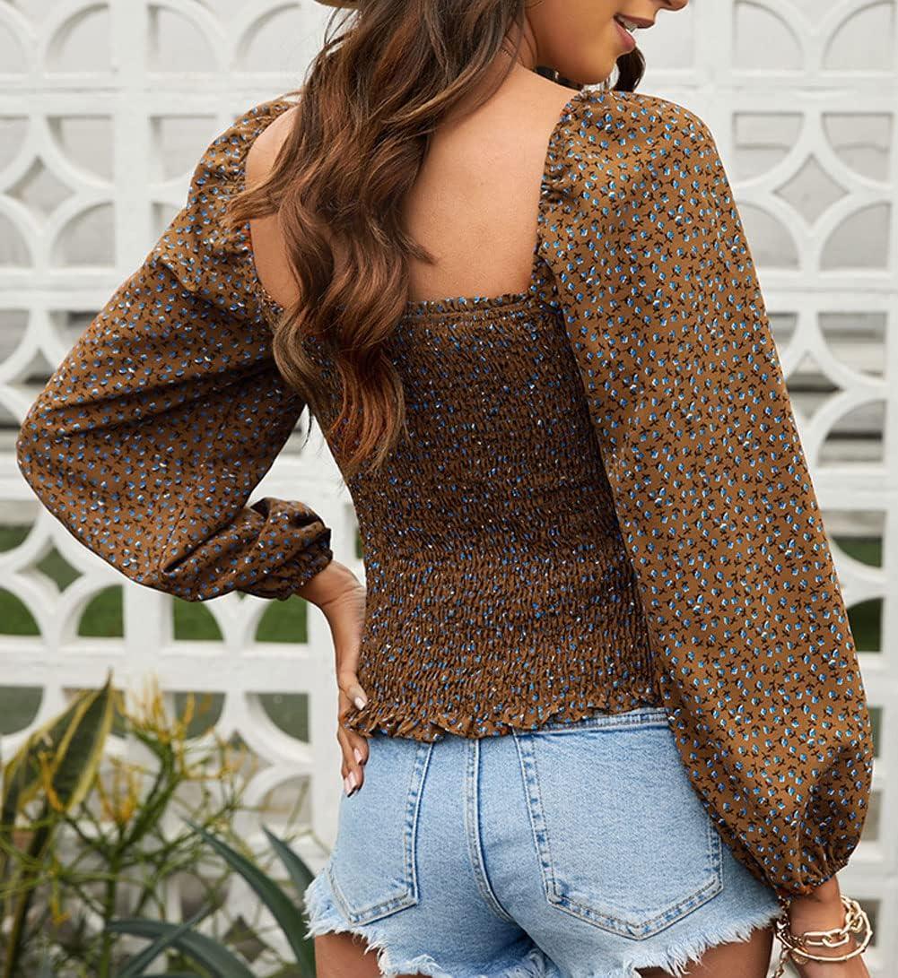 CHARTOU Women Cute Puff Sleeve Smocked Cropped Long Sleeve Blouse Shirt Floral Square Neck Crop Top(Khaki)