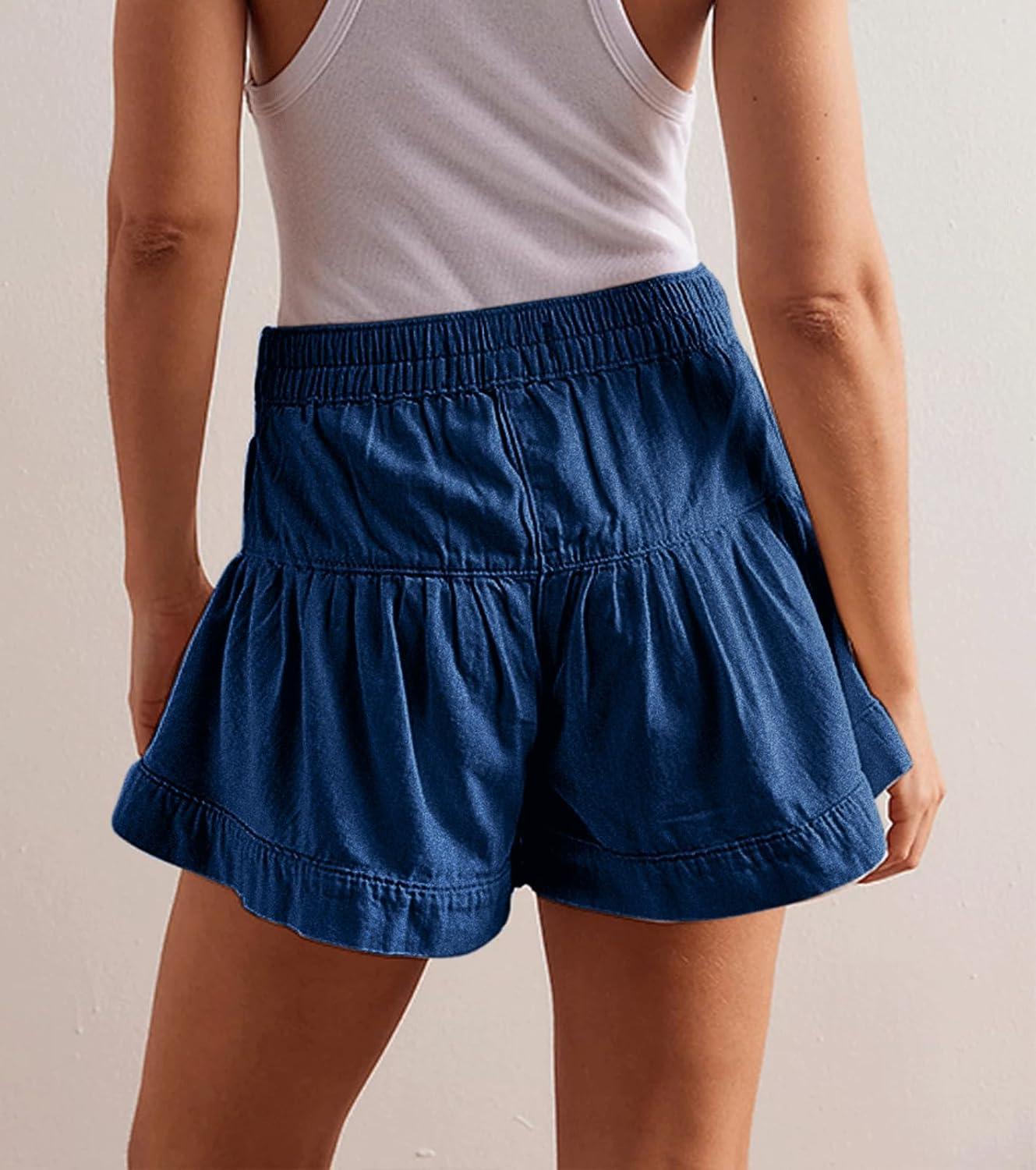 CHARTOU Women Cute Ruffle Hem Denim Short High Waist Wide Leg Jean Shorts Flare Stretchy Short with Pockets(Dark Blue)