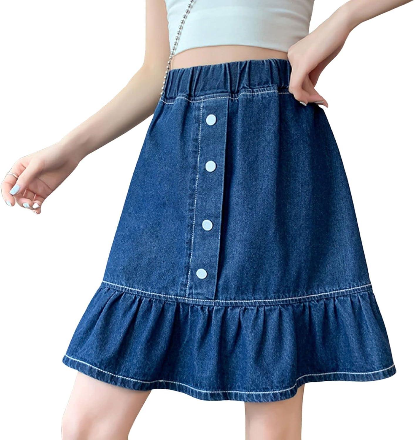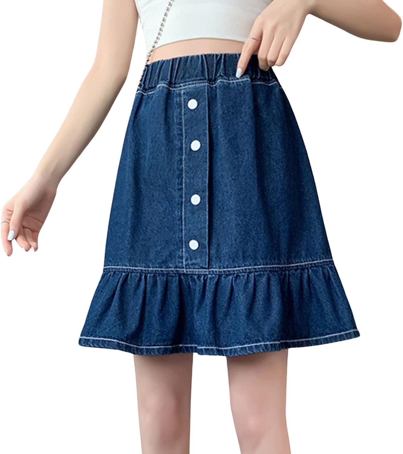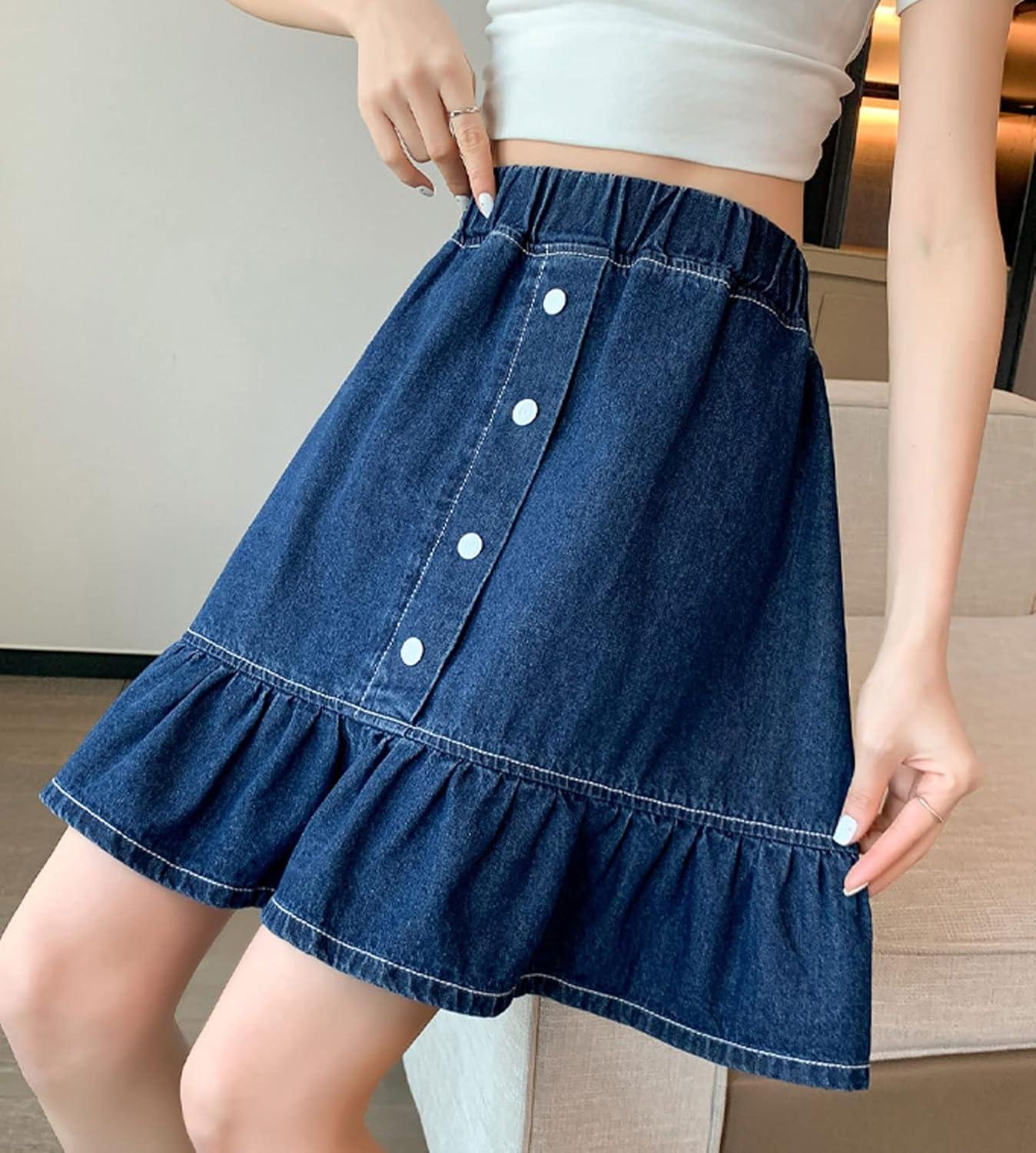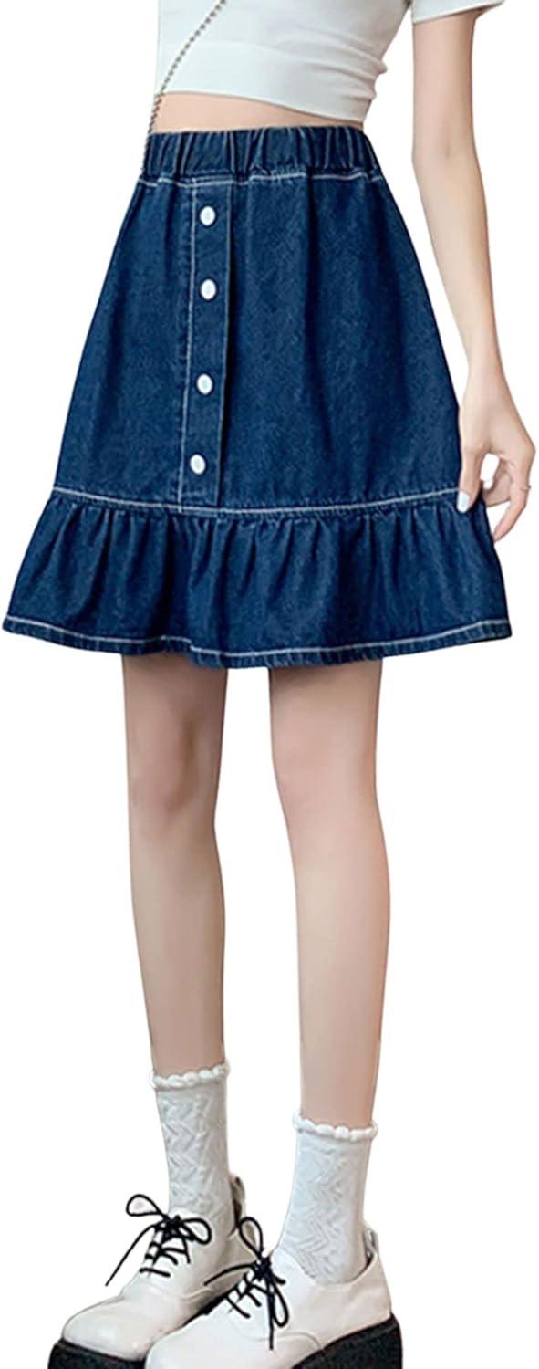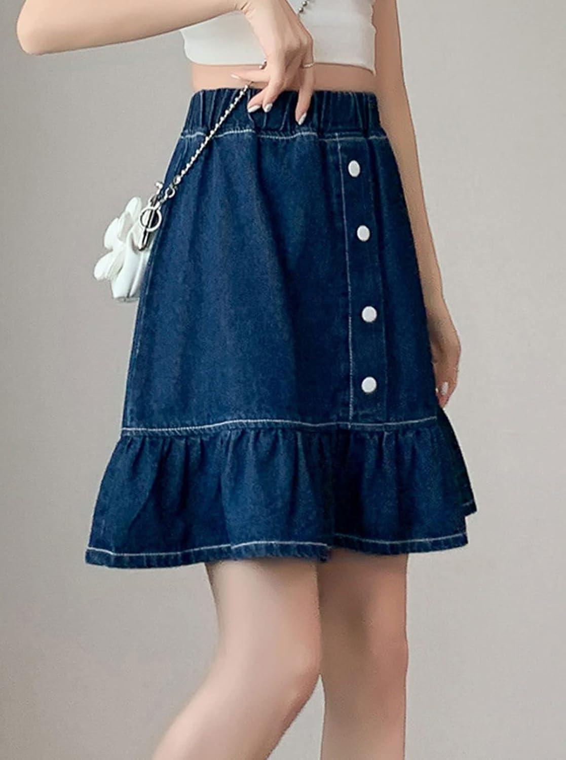 CHARTOU Women Denim Jean A Line Skirt Above Knee Flared Ruffle Skirt Button Elastic Waist Pleated Jean Skirt 90% Cotton, 10% Polyester Denim jean ruffle skirt Stretchy elastic high waist Lightweight and thin fabric, more comfortable and breathable to wear in spring and summer 【SELLING POINTS】—– Slim fit style/ Button bu front/ Stretchy elastic high waisted/ Flared A line skirt/ Ruffle hem skirt/ Patchwork style/ Blue jean skirt/ Above knee length short skirt 【VERSATILE DENIM SKIRT】—- Weekend cute floral print denim jean A line skirt boho skirts flared skirt, wear to work patchwork above knee short denim skirts denim jean ruffle skirt flared jeans y2k, casual daily wear denim jean short skirts kawaii skirt, holiday vacation going out cute A line denim mini skirt y2k above knee blue jean skirt denim pleated jean skirt