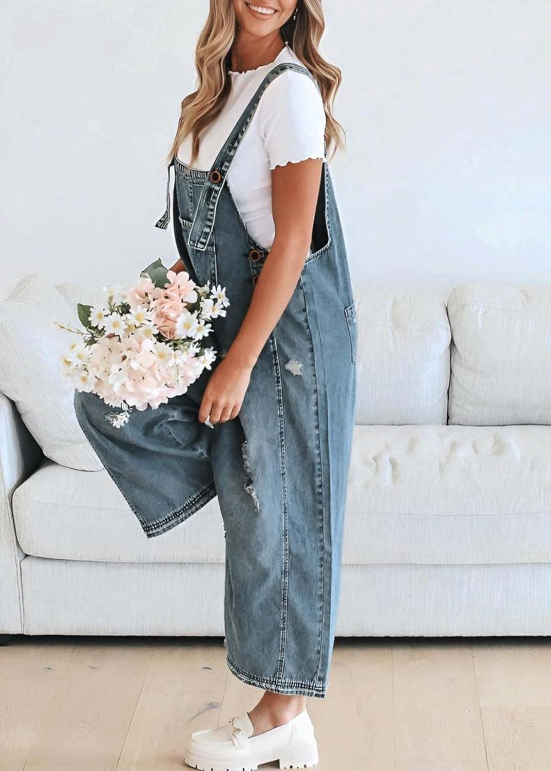 CHARTOU Women Distressed Strap Denim Bib Overall Baggy Cropped Ripped Jeans Jumpsuit Wide Leg Pants Pockets(Dark Blue)