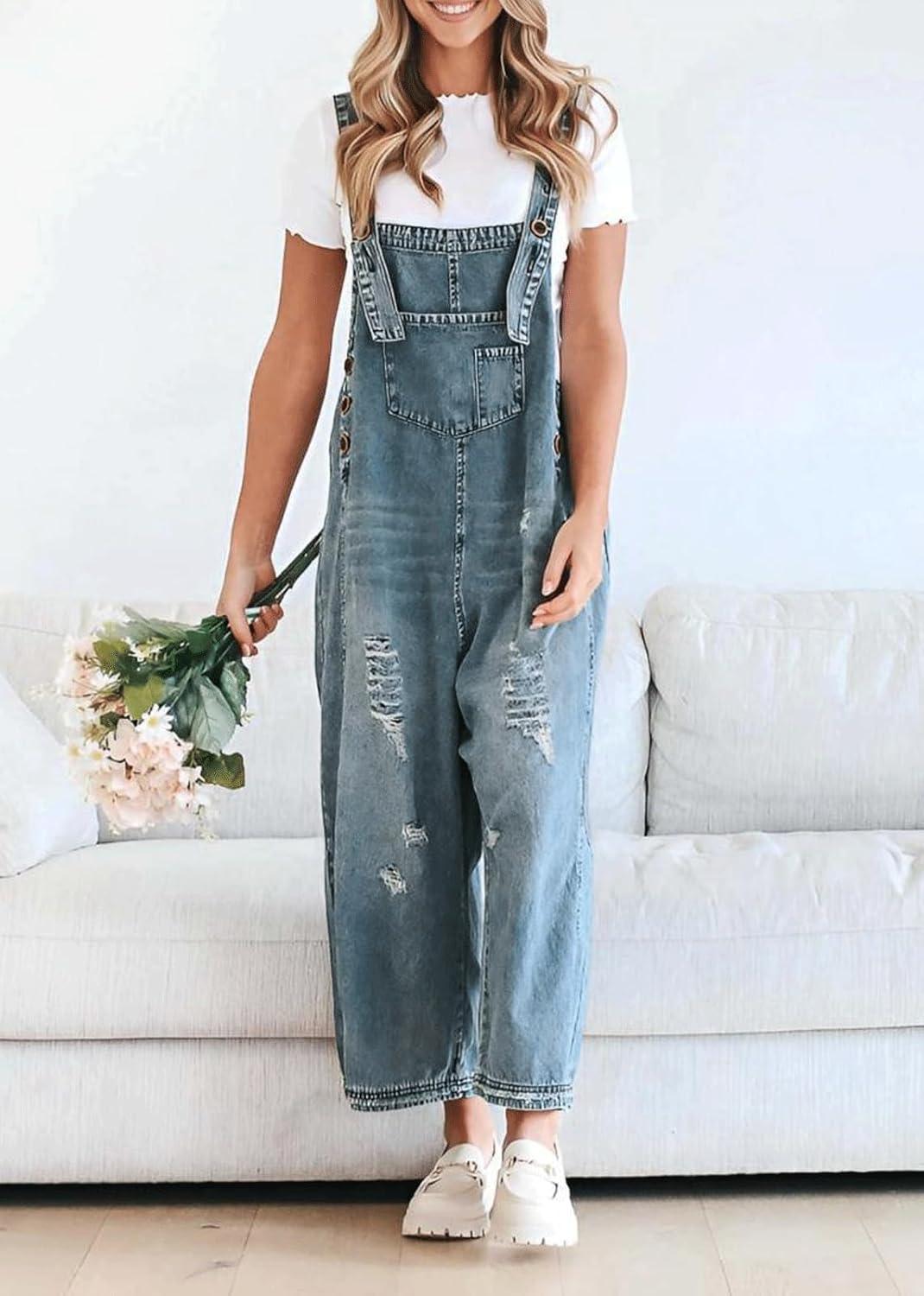 CHARTOU Women Distressed Strap Denim Bib Overall Baggy Cropped Ripped Jeans Jumpsuit Wide Leg Pants Pockets(Light Blue)