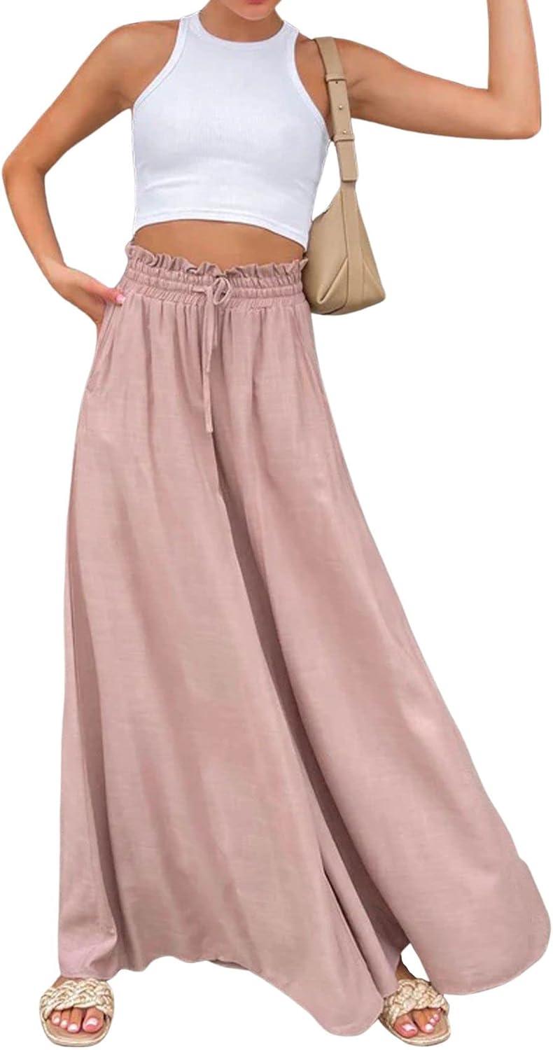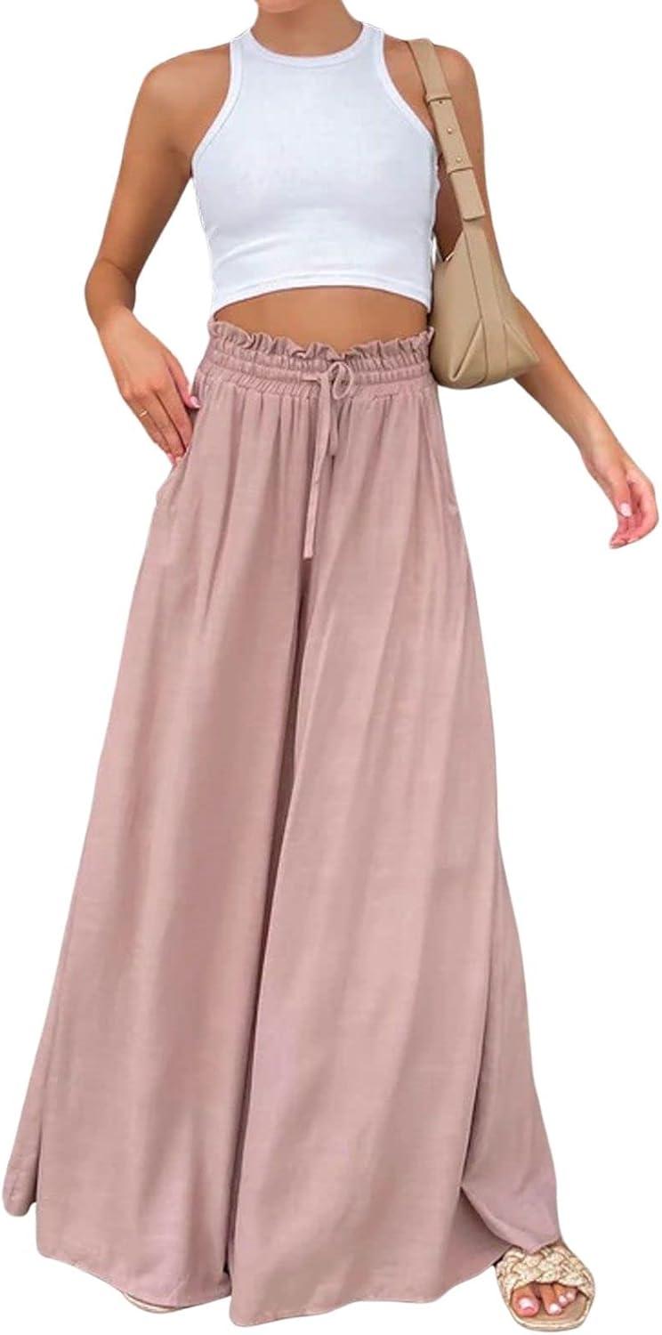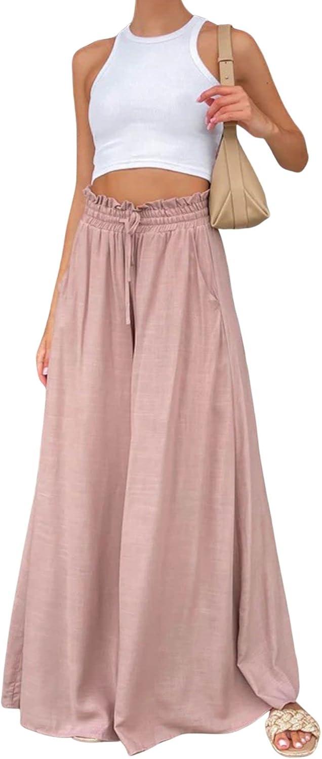 CHARTOU Women Elastic Waist Wide Leg Palazzo Pants Flowy Beach Pants Lounge Trousers Flared Pants Culottes(Pink)