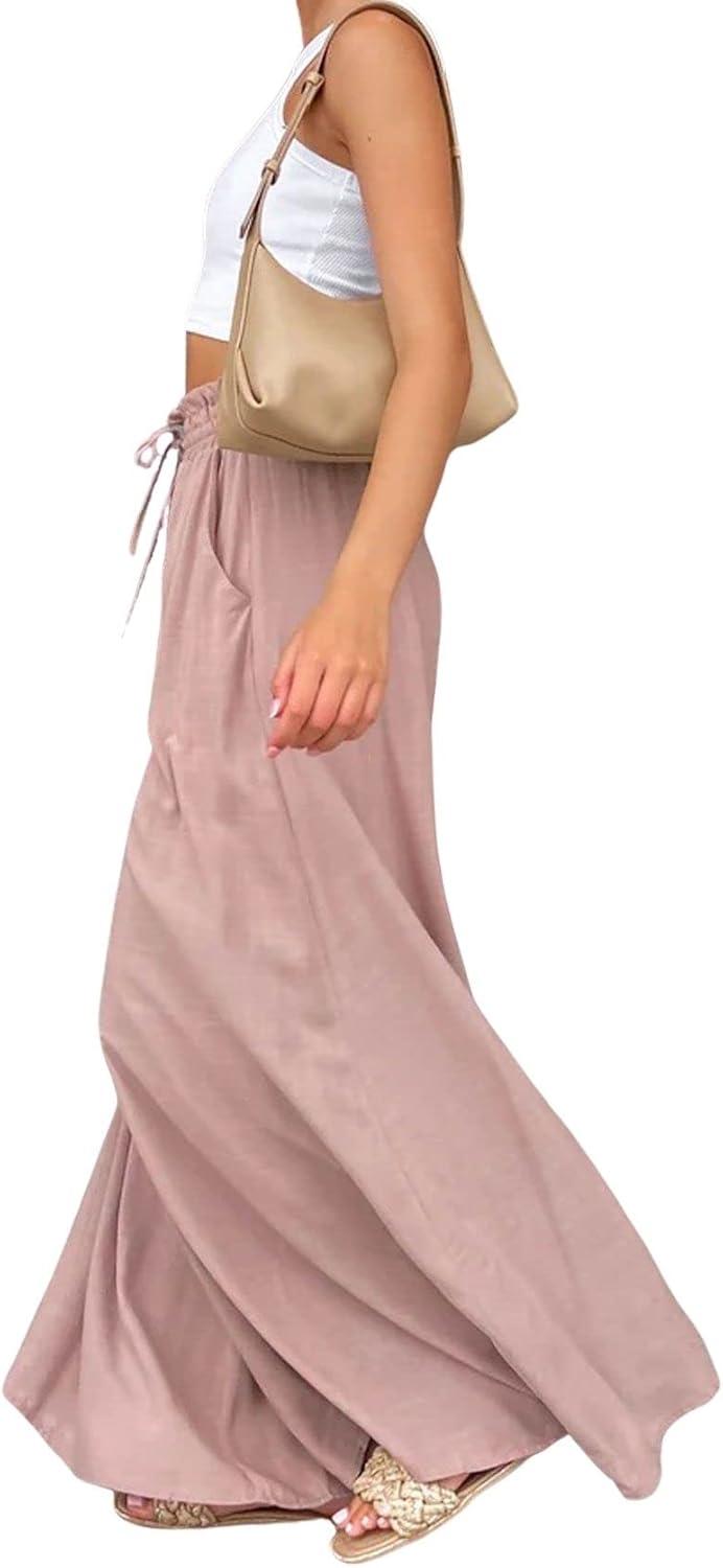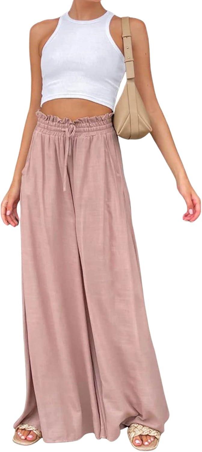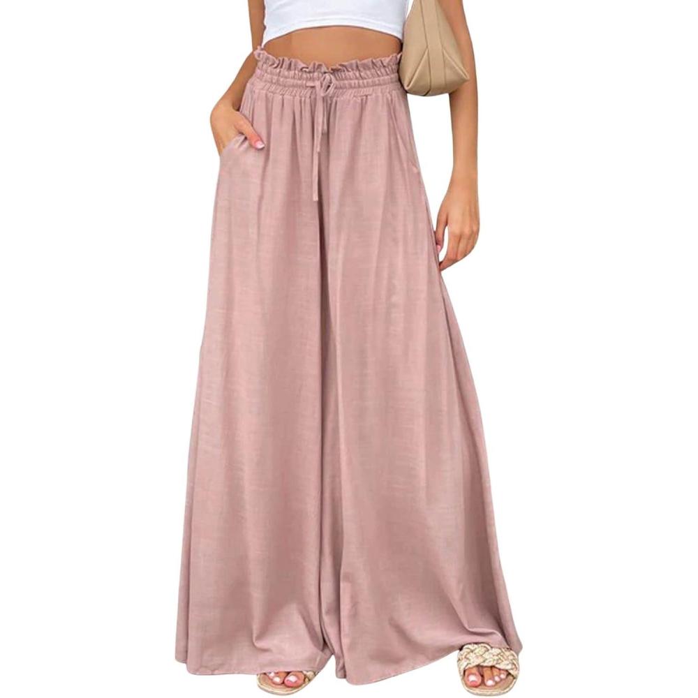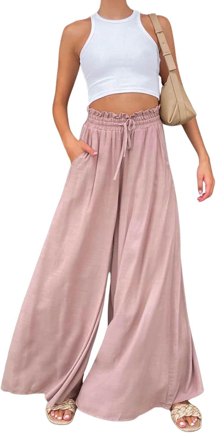 CHARTOU Women Elastic Waist Wide Leg Palazzo Pants Flowy Beach Pants Lounge Trousers Flared Pants Culottes(Pink)