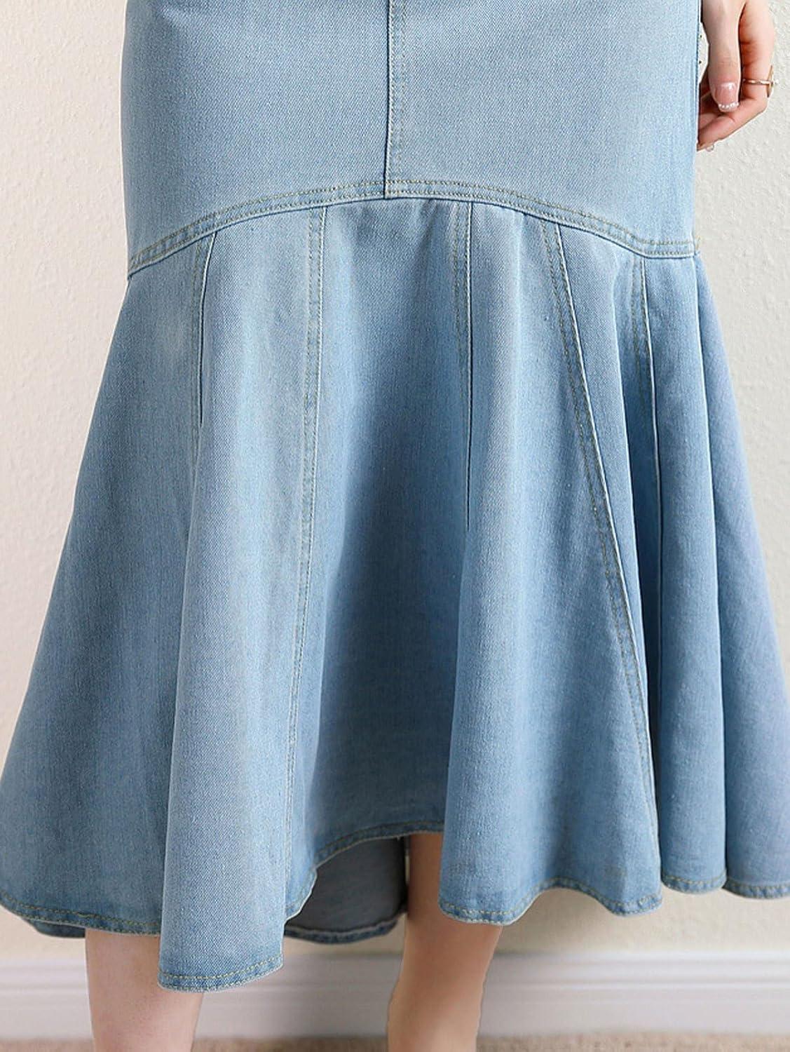 CHARTOU Women Elegant Fish Tail Long Jean Dress High Waist Ruffle High-Low Hem Party Stretchy Denim Skirt(Blue)
