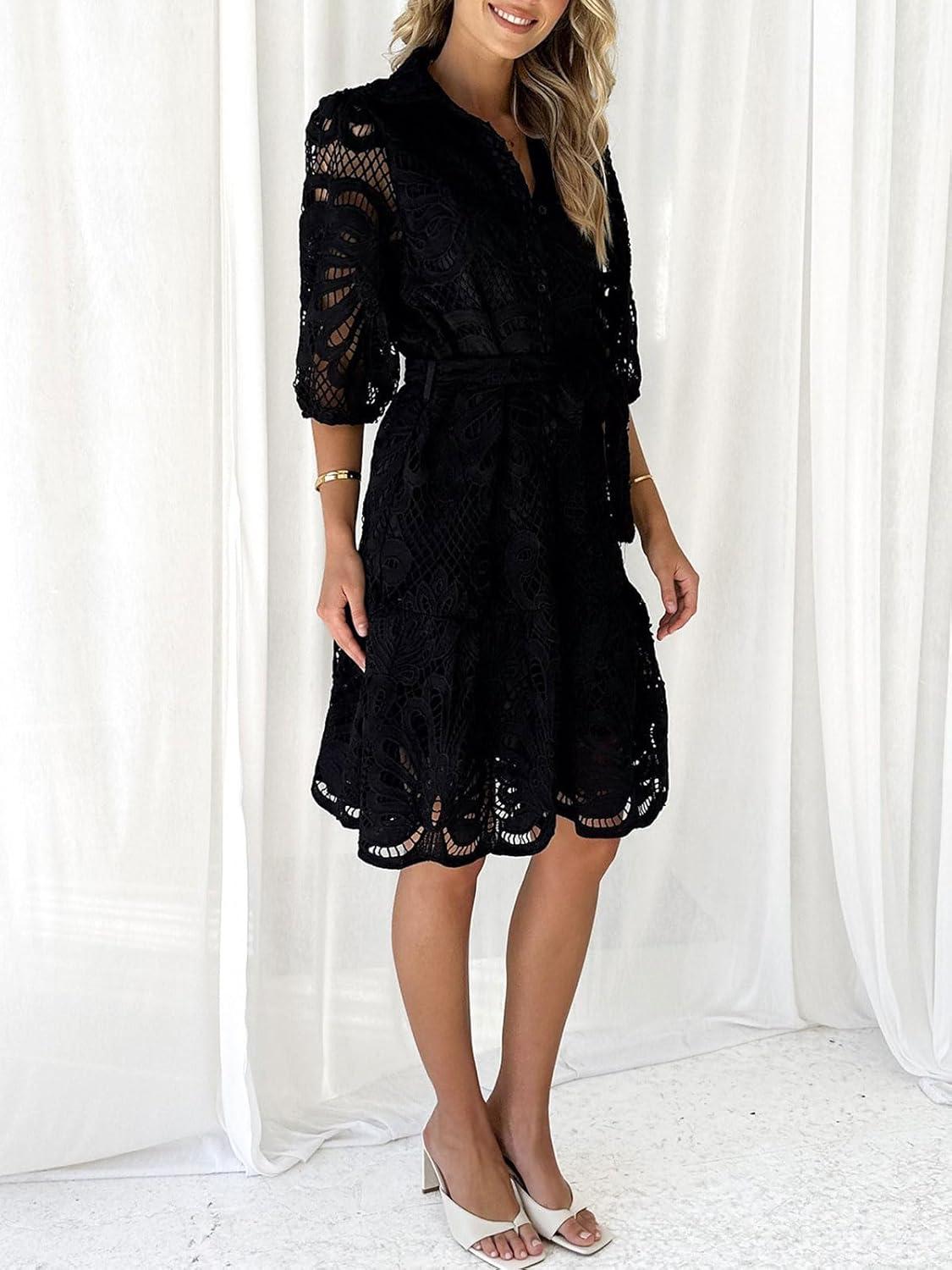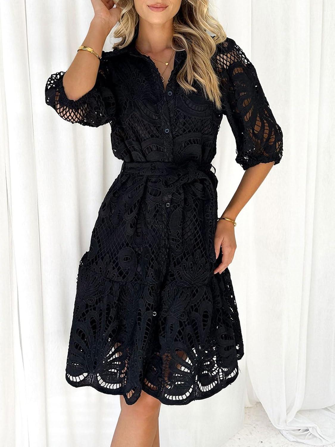 Women Elegant Lace Lined Short Shirt Dress Puff Sleeve Cut Out Button Down Mini Dress Lapel collared neck shirt dress/ Lace floral party dress/ Lace shirt dress with lining/ Dressy half sleeve ruffle short dress/ Button up dress with curve hem/ Elegant tiered mini dress with belt Crochet lace dress with lining, not see-through, 1/2 puff sleeve, long lapel shirt women, button down closure, layered and tiered, elegant floral lace shirt dress, 1 belt, easy to adjust this cut out lined dress fit, knee-length, mesh cocktail dress, curve hemline, solid color- black little dress, rose wedding guest dress, Blue summer dress women Summer lapel collar short shirt dress for women cocktail party dress outwears, button down dress for women casual work, lace lined mini dress with belt for women trendy, wedding guest dress This elegant lace dress for women summer short sleeve shirt dress Womens elegant lace shirt dress short puff sleeve cocktail dress belt hollow out mini dress tiered lined ruffle dress for women dressy crochet lace black dress summer button down long shirt v neck layered sundress blue wedding guest dress