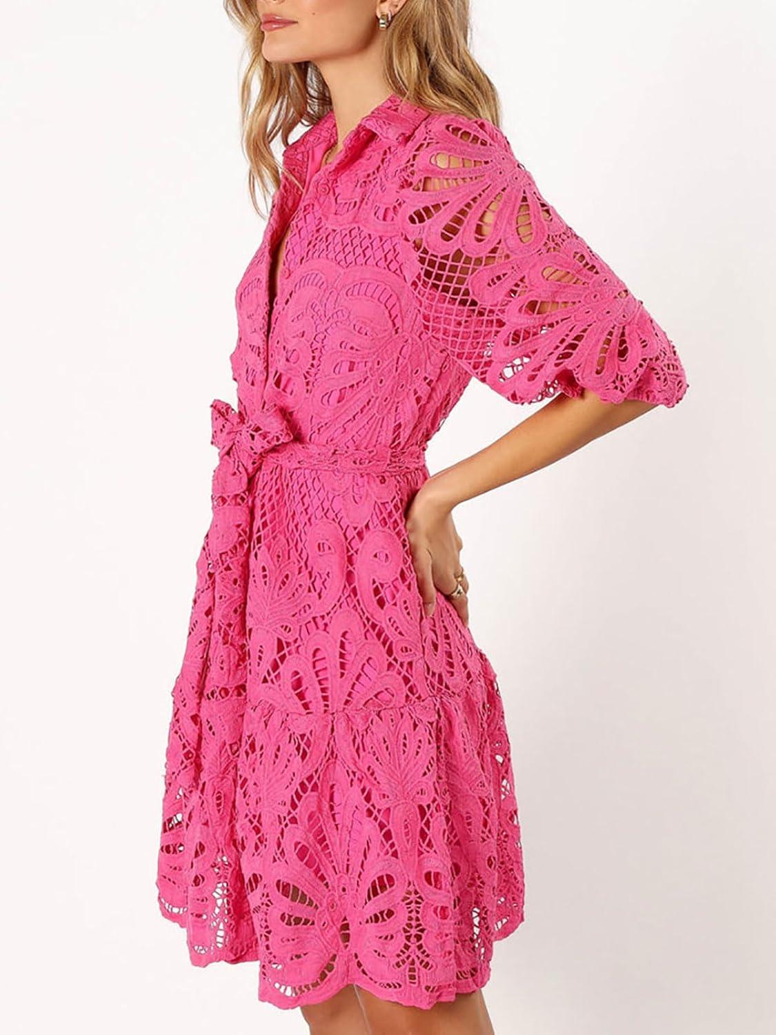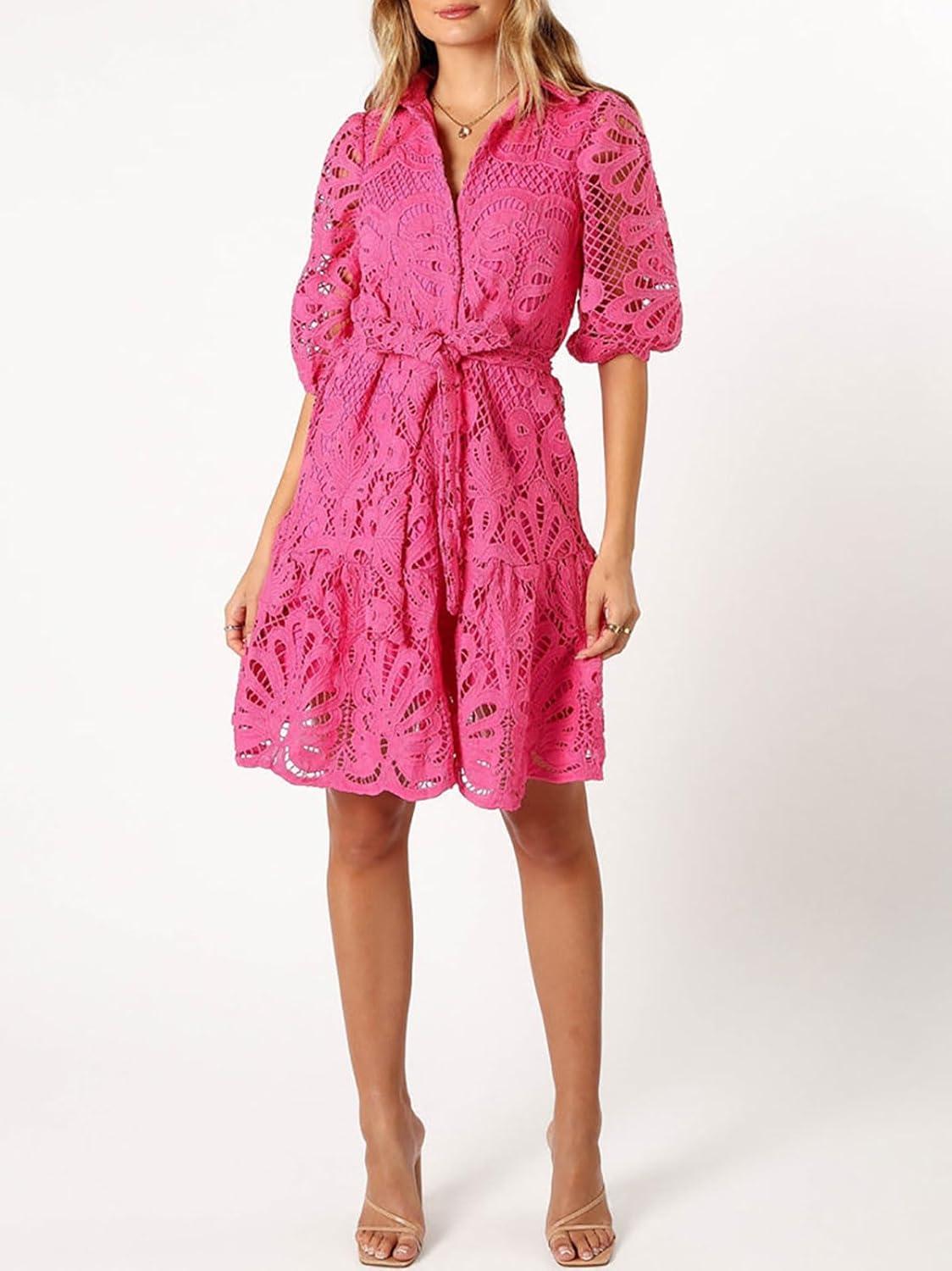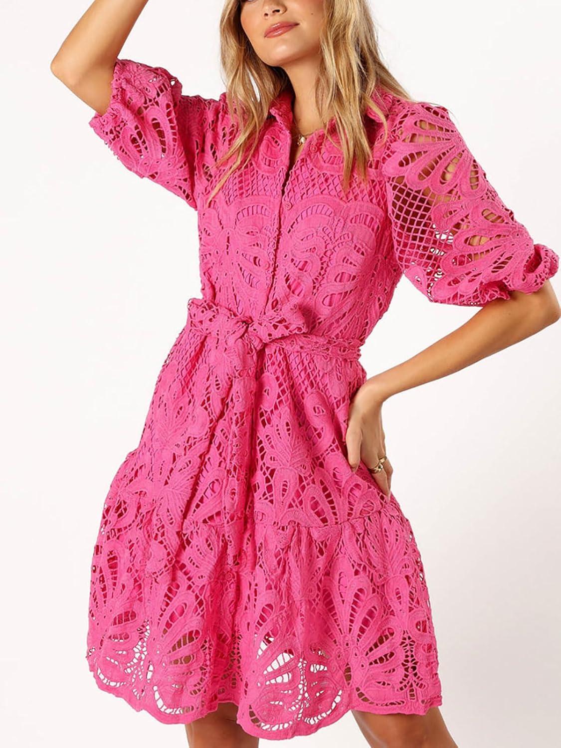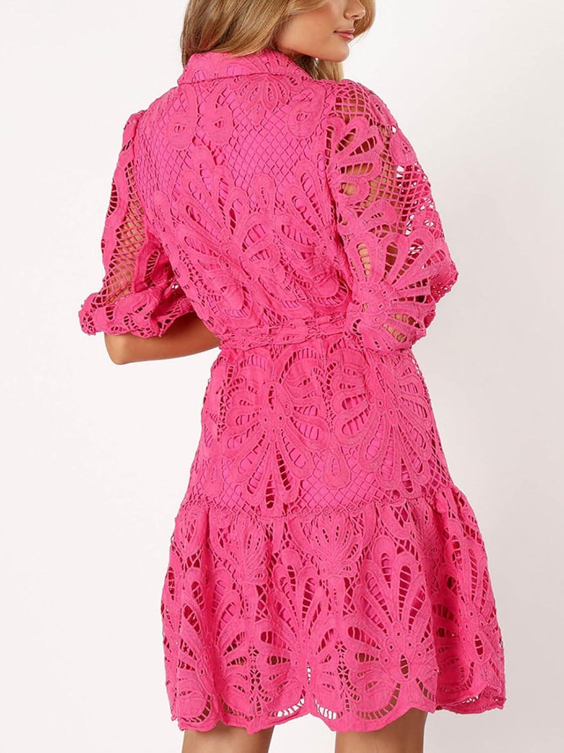 CHARTOU Women Elegant Lace Lined Short Shirt Dress Puff Sleeve Cut Out Button Down Mini Dress(Rose)