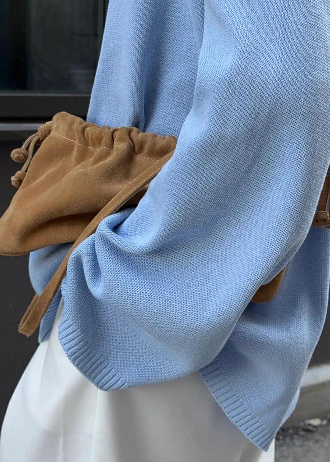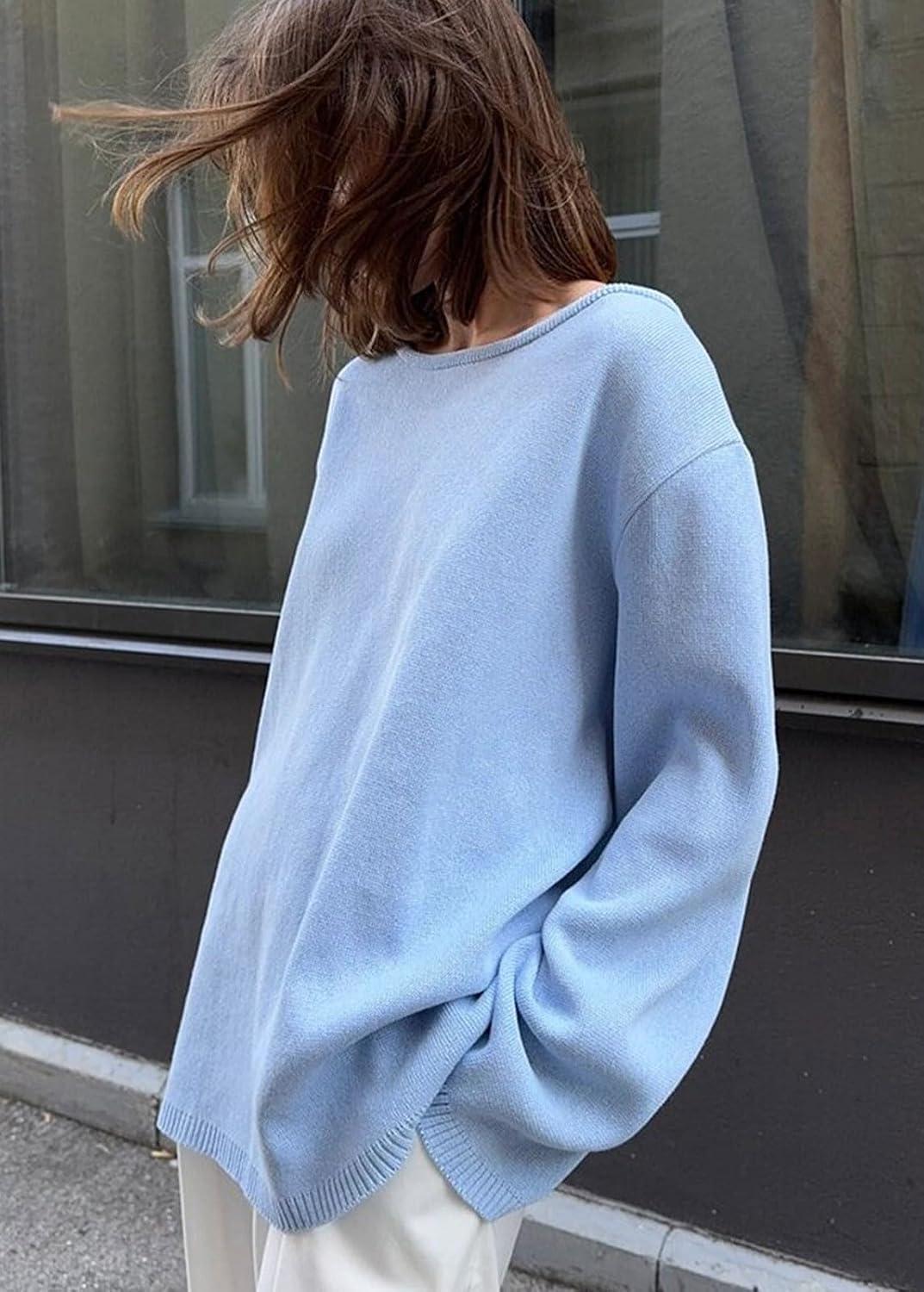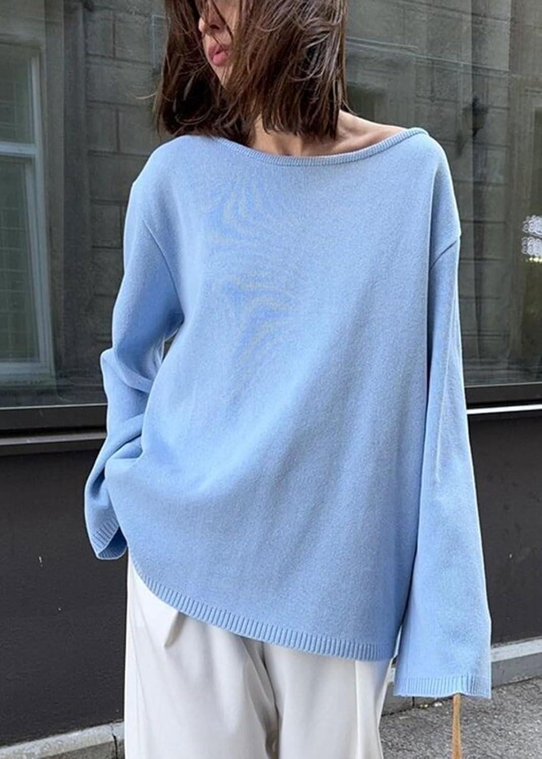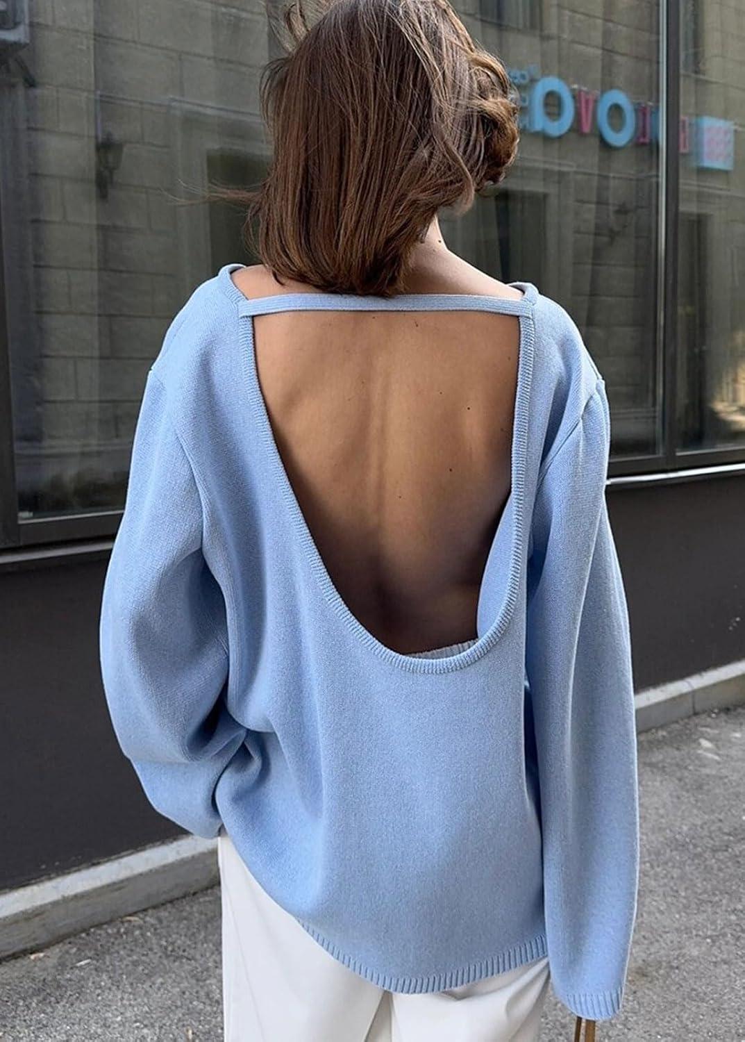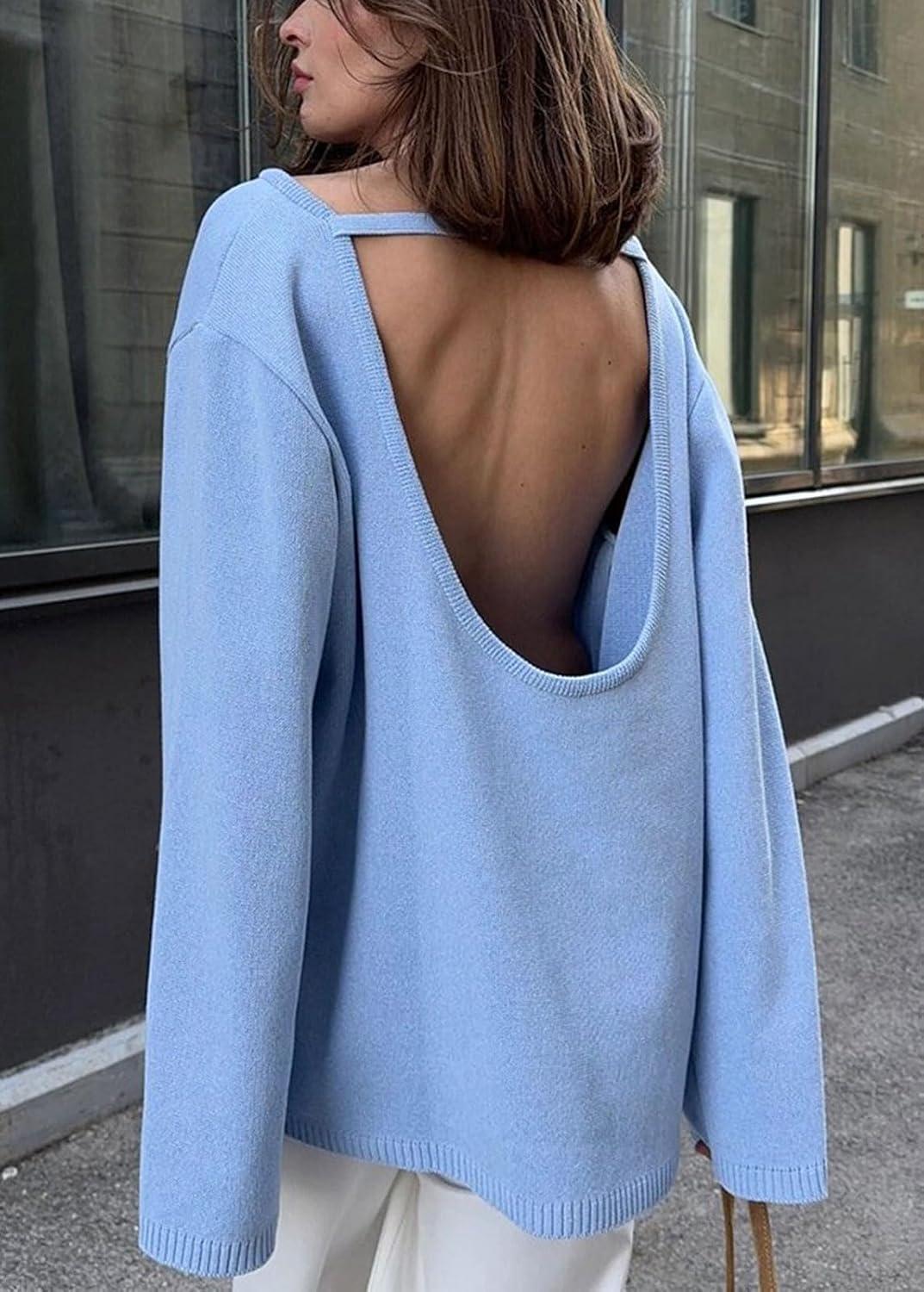 CHARTOU Women Fall Lightweight Oversized Sweater Scoop Neck Backless Cotton Pullover Sweater(Blue)
