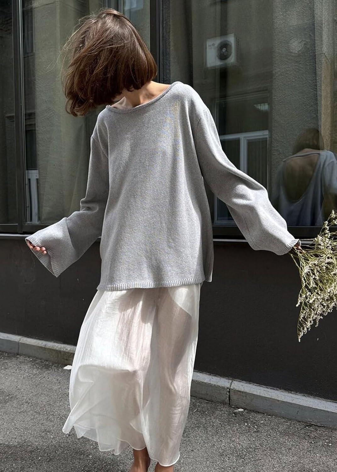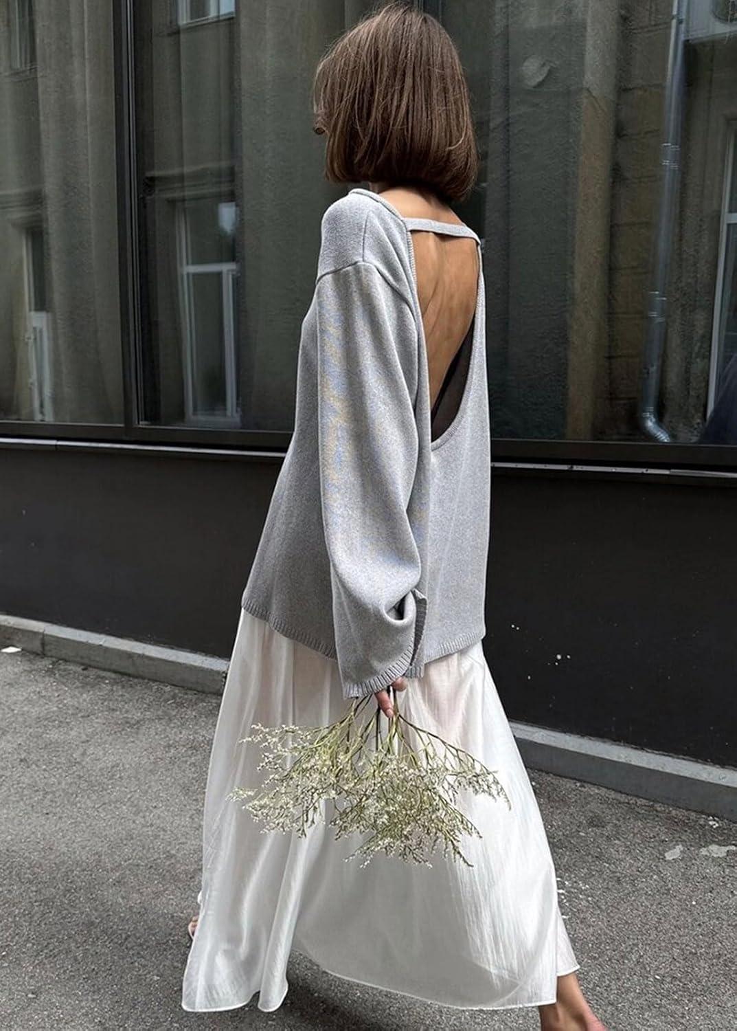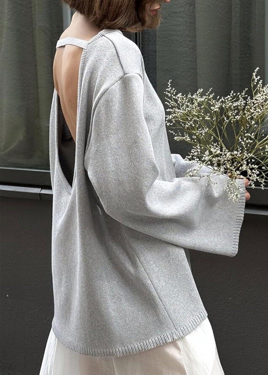 CHARTOU Women Fall Lightweight Oversized Sweater Scoop Neck Backless Cotton Pullover Sweater(Grey)