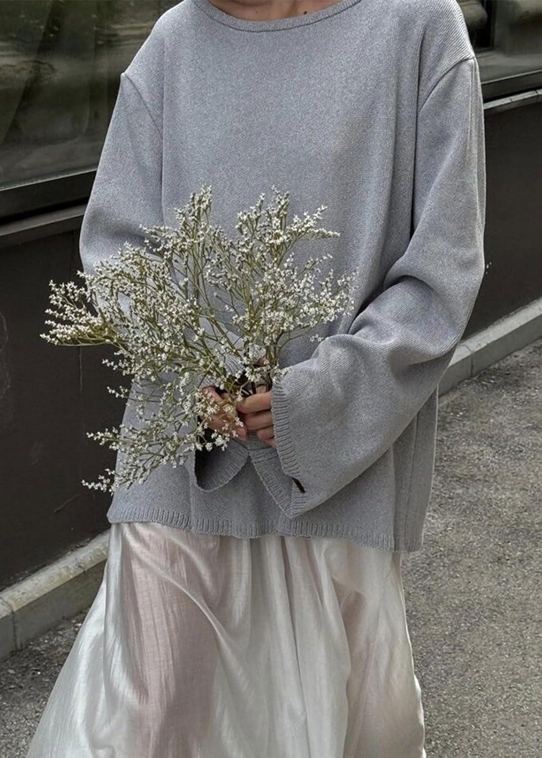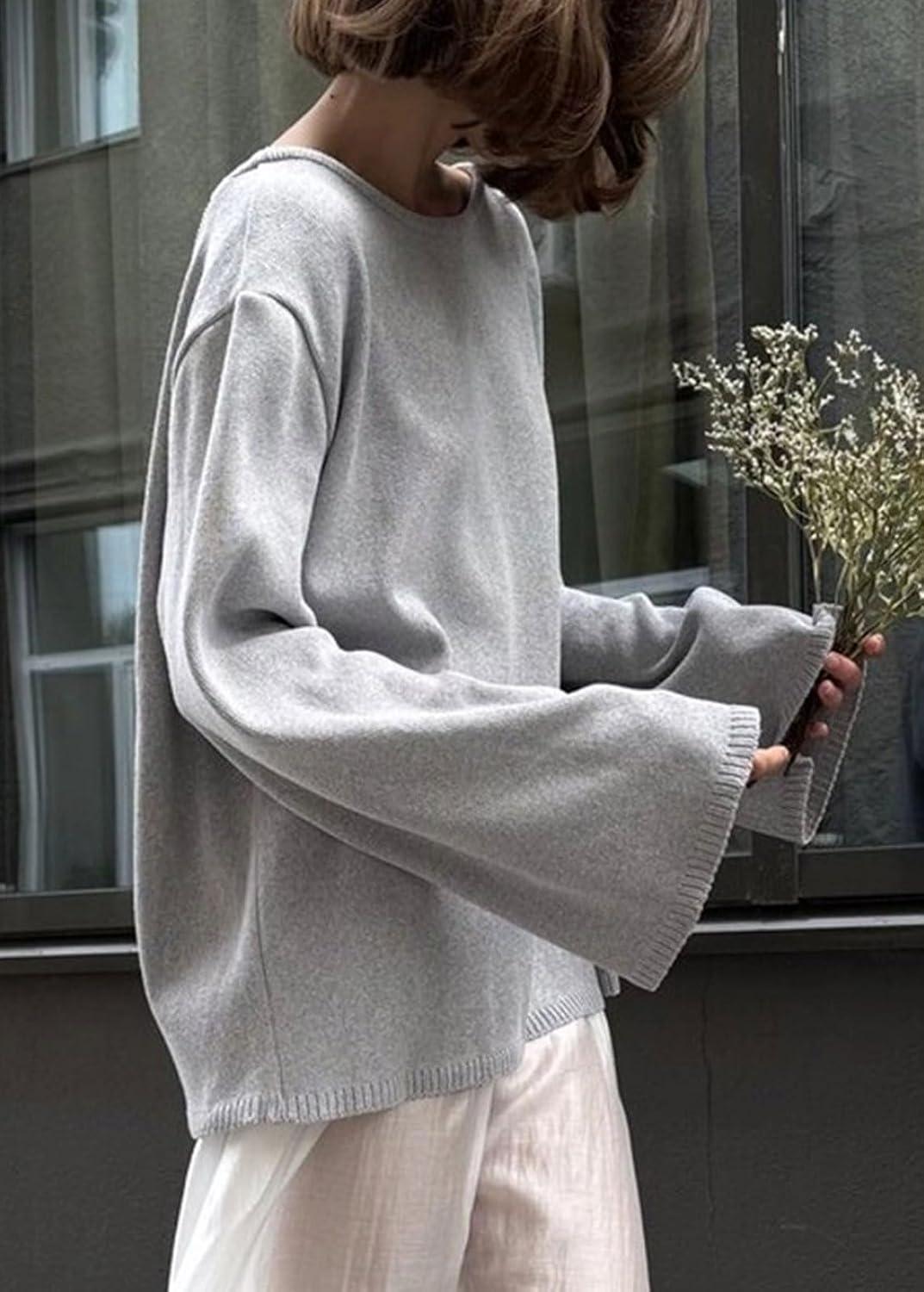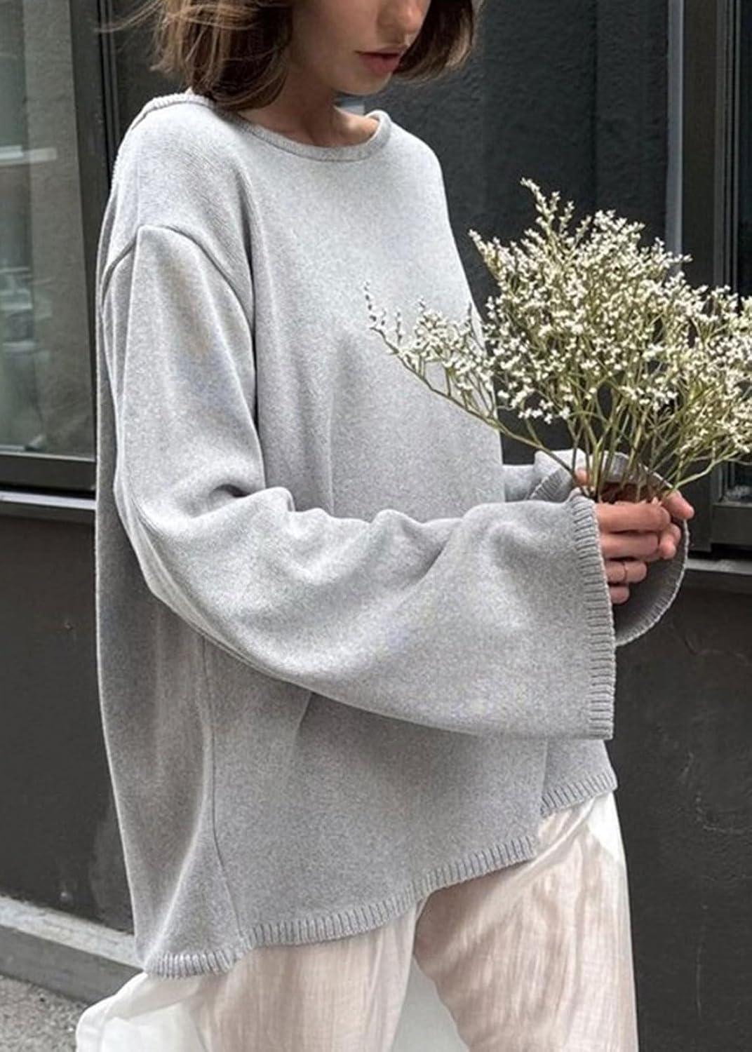 CHARTOU Women Fall Lightweight Oversized Sweater Scoop Neck Backless Cotton Pullover Sweater(Grey)
