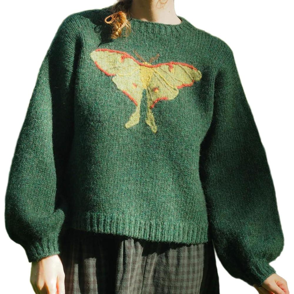 CHARTOU Women Fall Oversized Sweater Cute Insect Pattern Knit Pullover Sweater Crew Neck Short Jumper(Green)