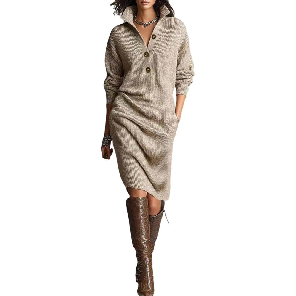 CHARTOU Women Fall Sweater Dress Turtleneck Half Button Casual Oversized Pullover Sweater Midi Dresses with Pockets(Khaki)