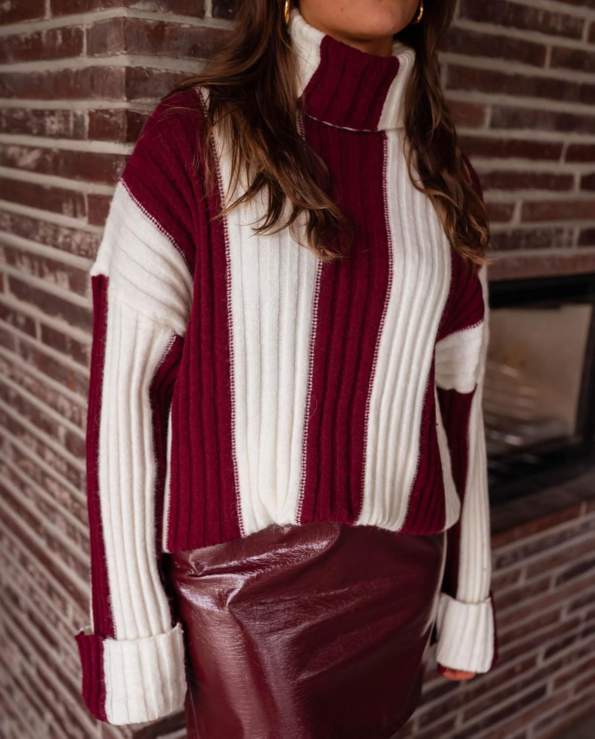 Women Fall Winter Turtleneck Sweater Color Block Patchwork Striped Knit Pullover Sweater Tops/ Warm turtleneck pullover sweater/ Chic contrast color patchwork sweater tops/ Loose fit fall knit sweatshirt/ Size Tips: S=US 4-6, M=US 8-10, L=US 12-14, XL=US 16-18, XXL=US 20; Constructed with comfort rib-knitted texture fabric, this color block sweater pullover offers flexibility to accommodate various body shapes and sizes, effortlessly providing a flattering fit/ Color Block Sweater Tops: Contrast color striped sweater pullover effortlessly show your sophisticated character, also visually sculpting your figure, wear with your mini skirt, or legging for a stylish look/ Design: Our women loose color block sweater featuring rib-knit textured, turtle high neck pullover sweater, loose drop shoulder knit tops, extra long sleeve, roll cuffed for an unique look, stitching patchwork sweater, heavy warm winter sweater for women/ Versatile Contrast Pullover Sweater: Color block striped sweater for women casual wear/ Chic contrast color knit pullover sweatshirt for women fall winter outfits/ Loose color block green turtleneck sweater tops for women basic knitwear/ Chic wine long sleeve thick sweater for party going out outfits/ Classy black and white stripe pullover sweater for women comfort sweater tops