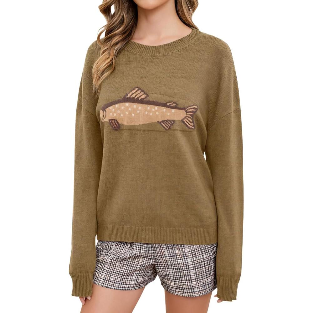 CHARTOU Women Fashion Crew Neck Rib Knit Crucian Carp Graphic Oversized Y2k Pullover Sweater Jumper(Brown)