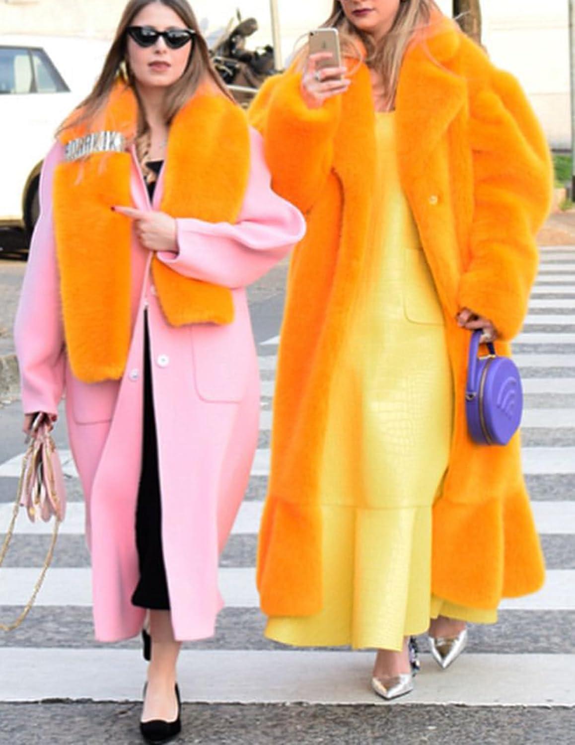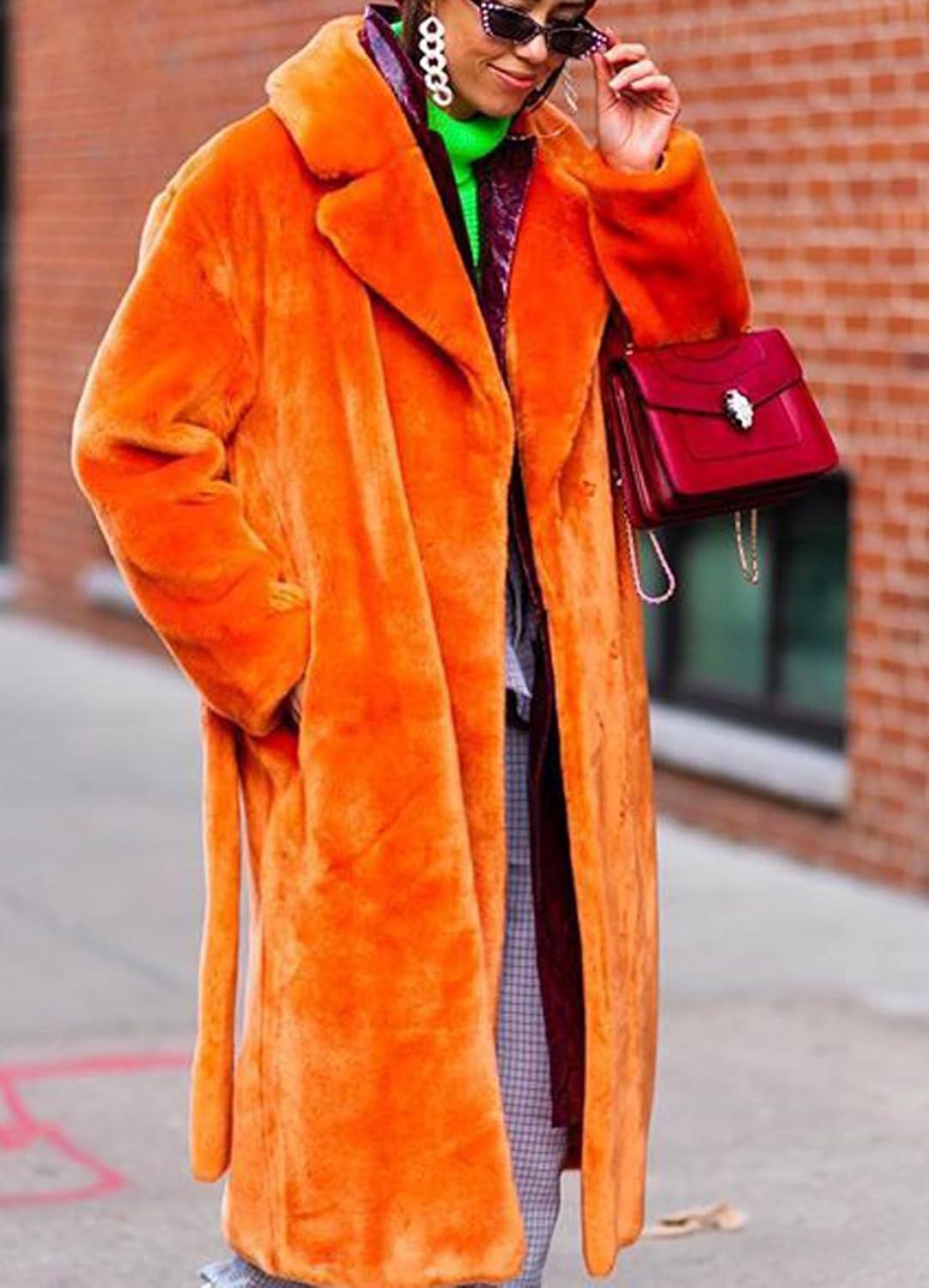CHARTOU Women Faux Fur Coat Long Sleeve Winter Fluffy Jacket Overcoat Warm Fuzzy Coat Cardigan with Belt Outdoor(Orange)