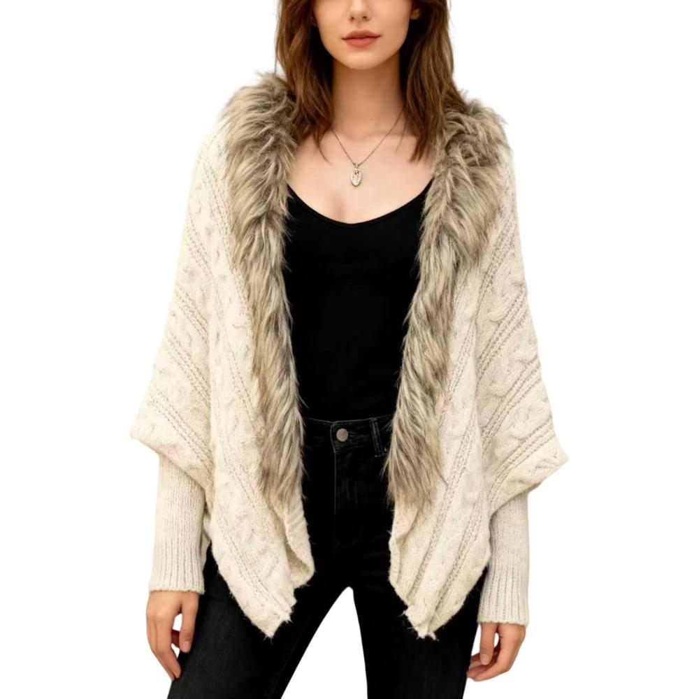 CHARTOU Women Faux Fur Trim Cardigan Sweater Fall Winter Open Front Batwing Sleeve Chunky Cable Knit Coat(Beige)