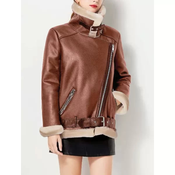 CHARTOU Women Faux Leather Jacket Fur Lined Winter Coat Warm Zip Up Notched Collar Moto Bomber Jacket(Brown Fur)