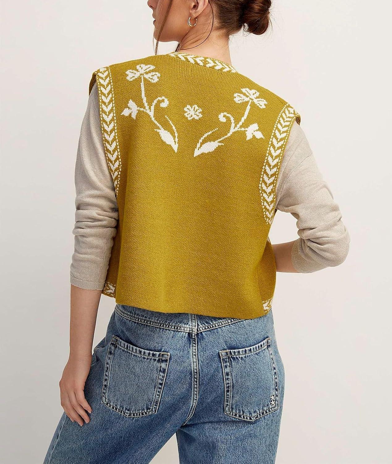 CHARTOU Women Floral Boho Knit Vest Top Vintage Open Front Cap Sleeve Sweater Short Vest Fall Outfits(Yellow2)
