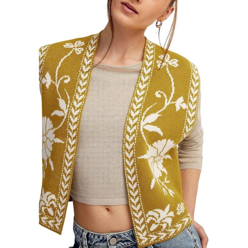 CHARTOU Women Floral Boho Knit Vest Top Vintage Open Front Cap Sleeve Sweater Short Vest Fall Outfits(Yellow1)