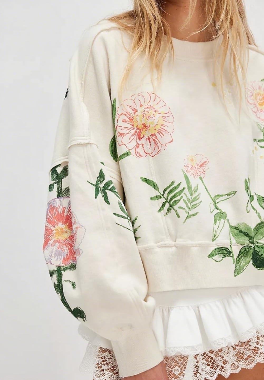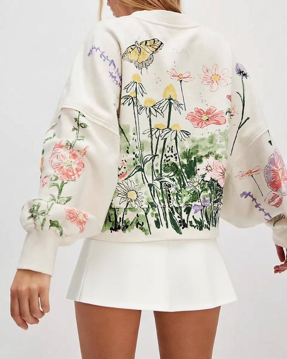 CHARTOU Women Floral Crop Pullover Sweatshirt Fall 2025 Oversized Drop Shoulder Long Sleeve Sweatshirt Top(White1)