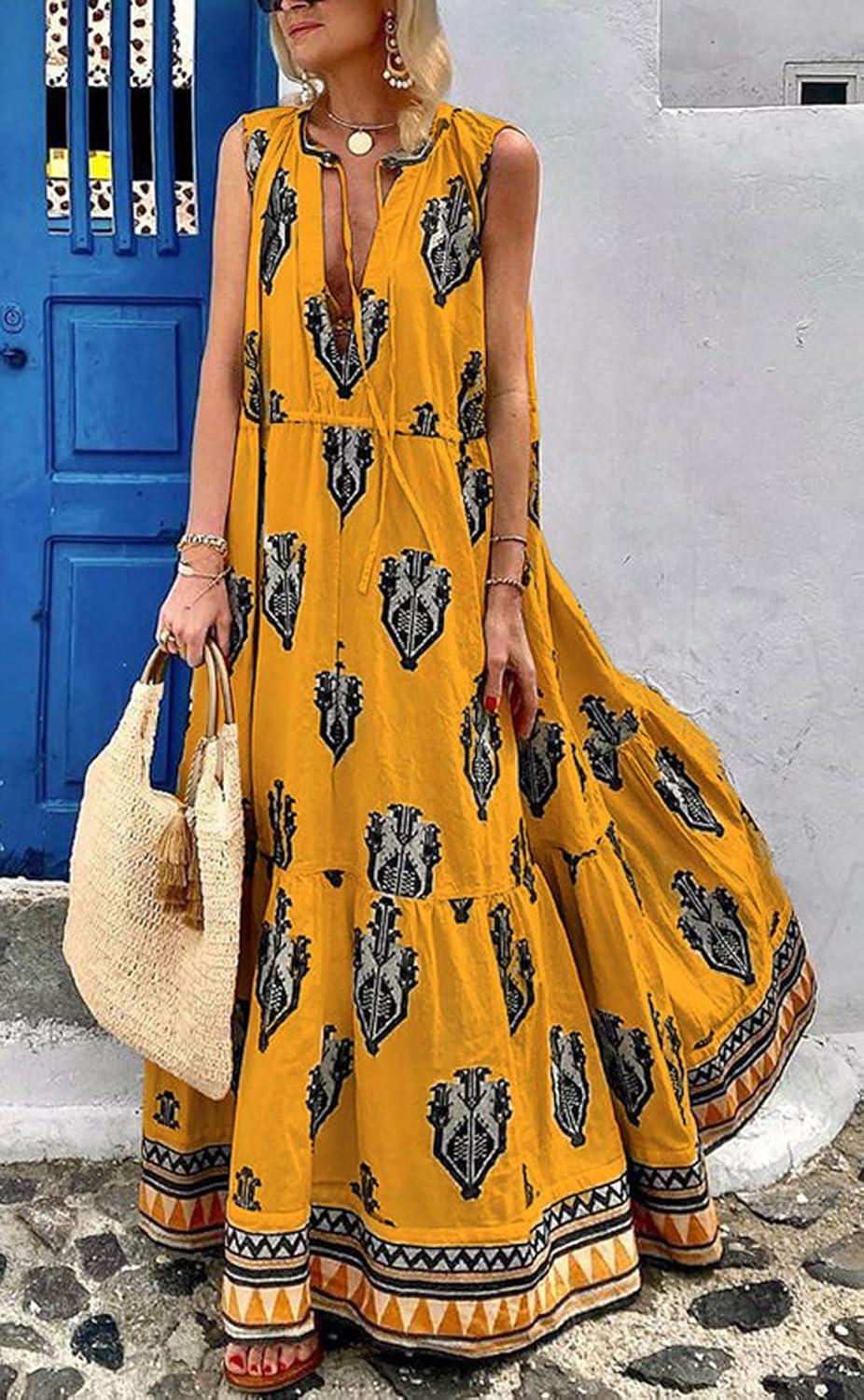 CHARTOU Women Floral Maxi Dress Summer Sleeveless Boho Flowy Long Dresses(Yellow)
