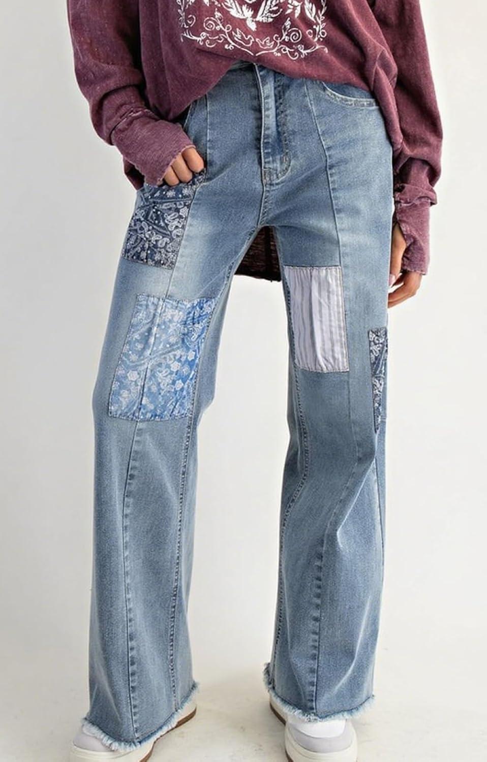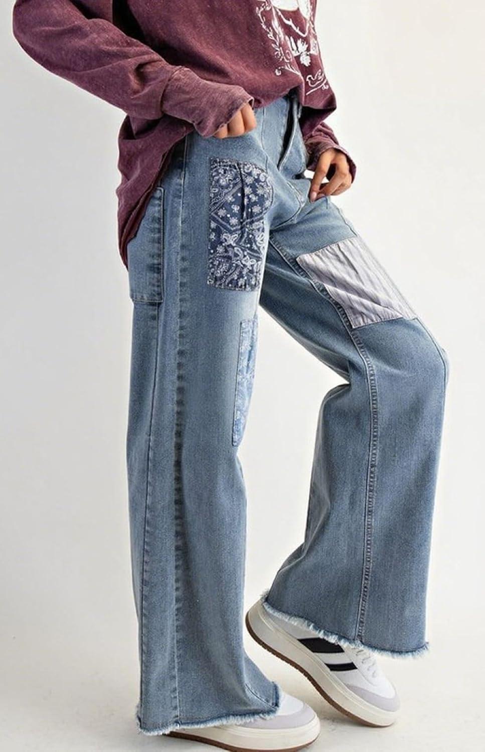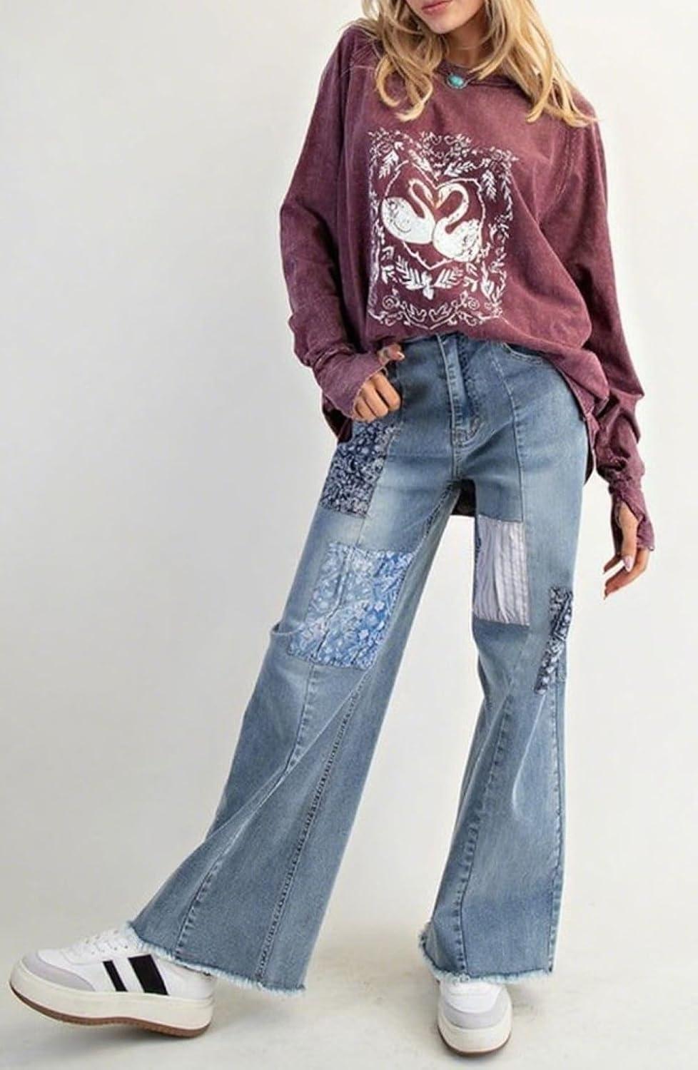 CHARTOU Women Denim Wide Leg Pants/ High Waist Flared Jeans/ Raw Hem Vintage Trousers with Pockets