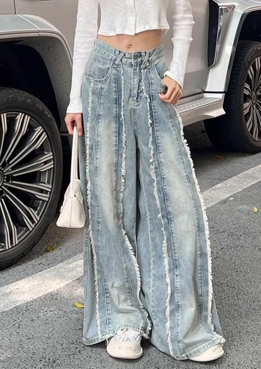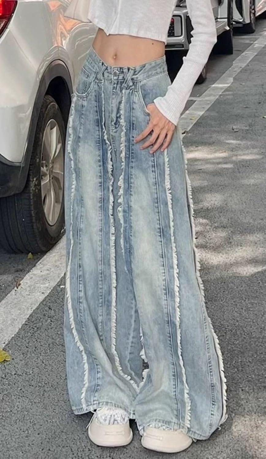 CHARTOU Women Frayed Jeans/ Patchwork Wide Leg Jeans/ Mid Rise Flared Pants/ Straight Baggy Long Jeans/ Washed Denim Retro Jeans