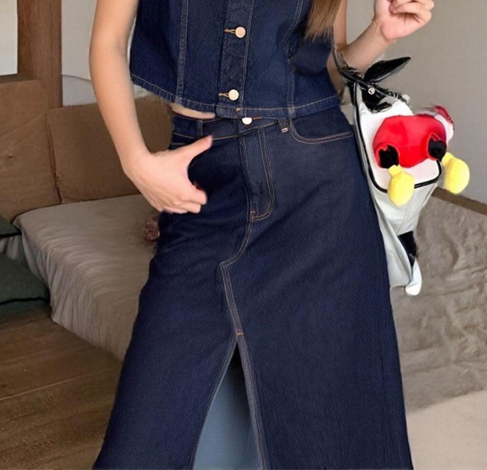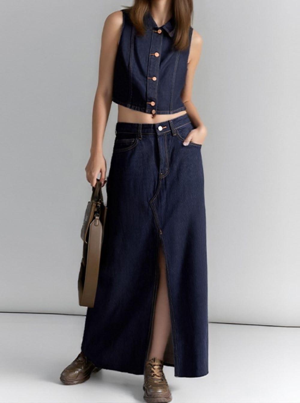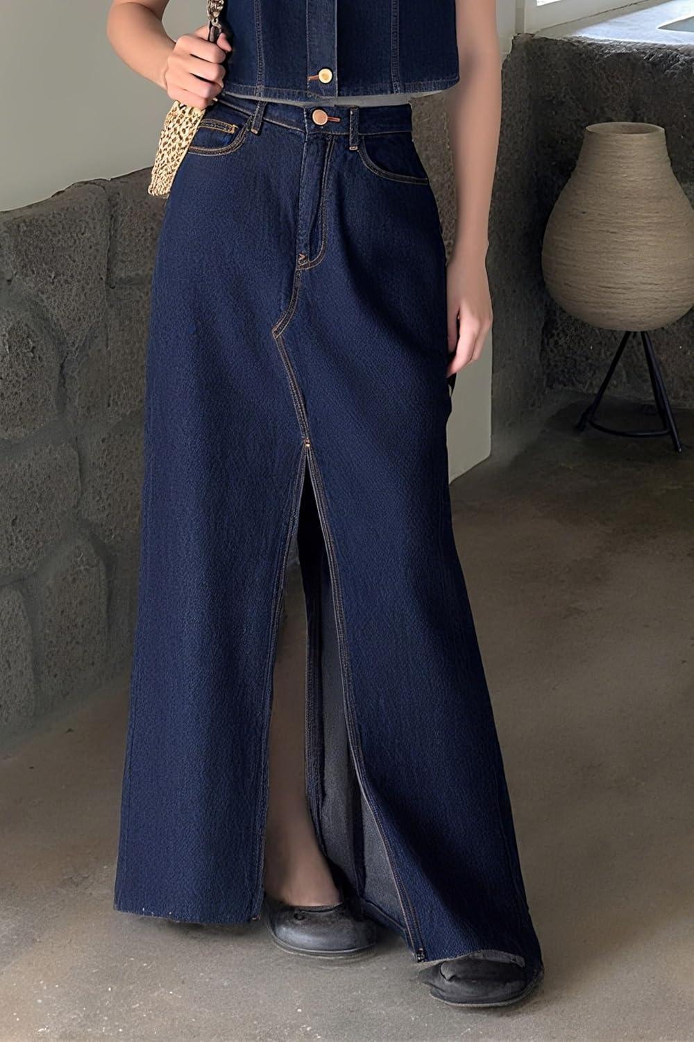 CHARTOU Women Denim Maxi Skirt/ Front Slit Sexy Skirt/ High Waist Long Skirt/ Floor Length Maxi Skirt/ Summer Beach Vacation Jean Skirt/ Navy Blue Summer Skirt