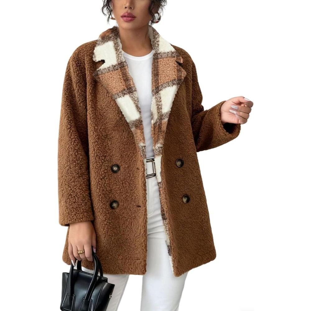 CHARTOU Women Fuzzy Fleece Sherpa Pea Coat Winter Plaid Double Breasted Overcoat Outwear Jacket(Brown)