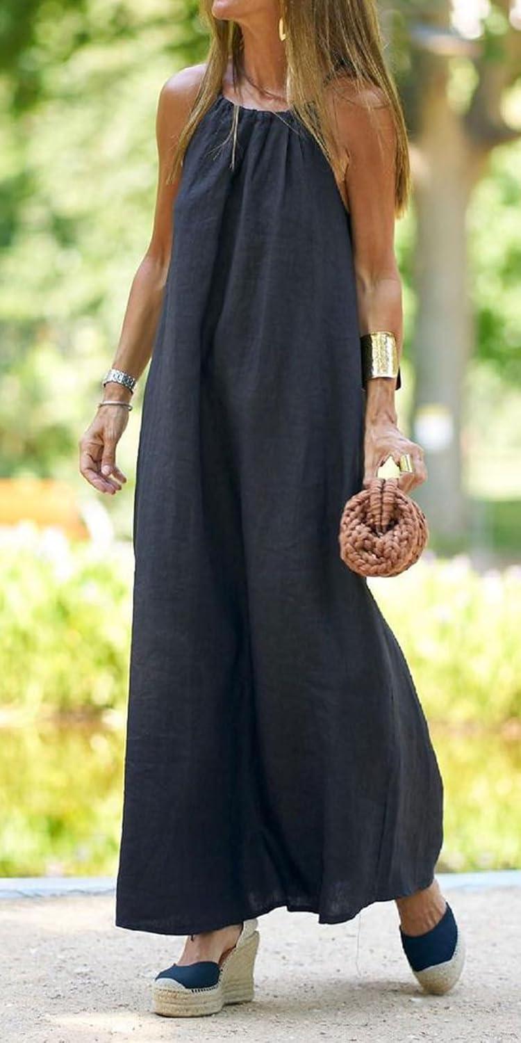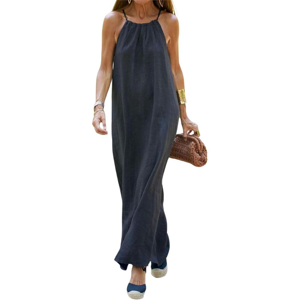 Sexy Halter Neck Long Dress/ Summer Beach Maxi Long Dress/ Casual Loose Split Linen Long Dress