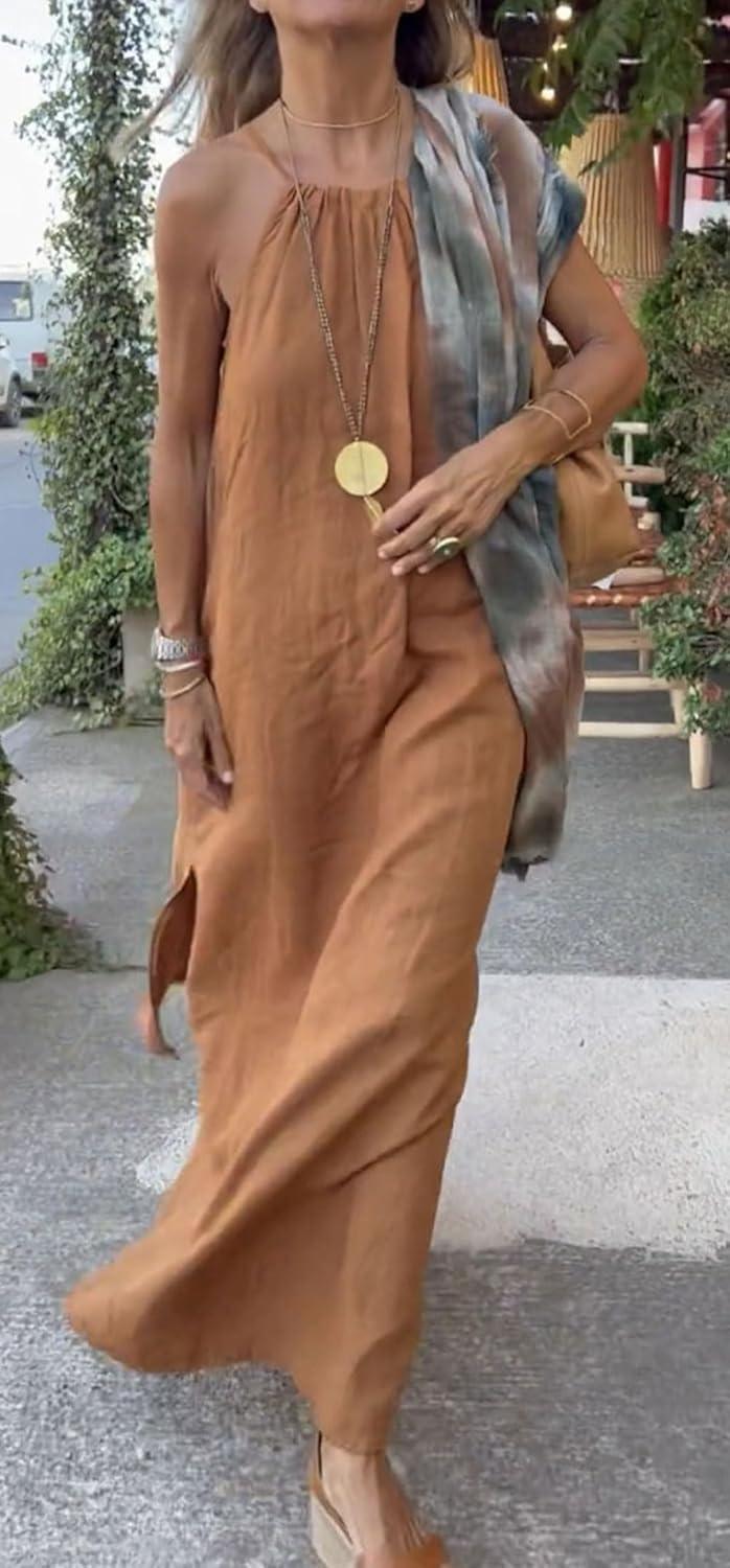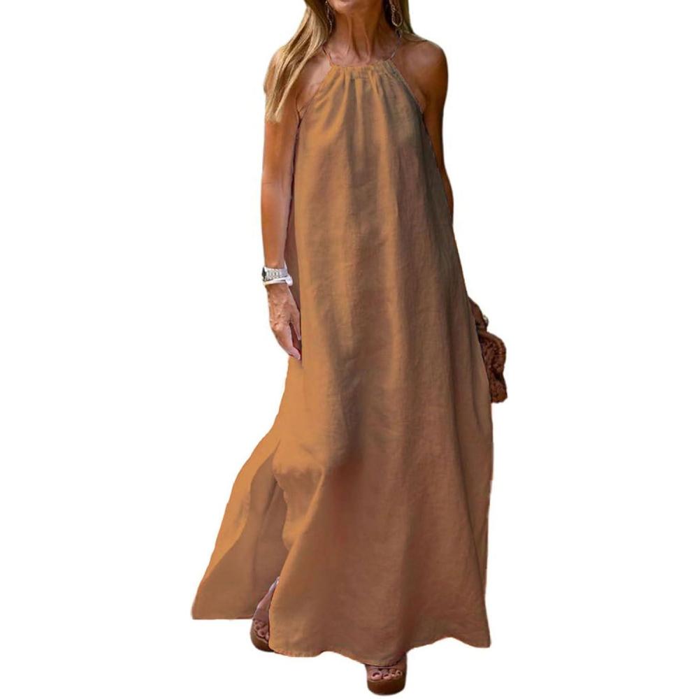 CHARTOU Women Halter Neck Side Slit Linen Maxi Dress Long Summer Beach Vacation Dress(Camel)