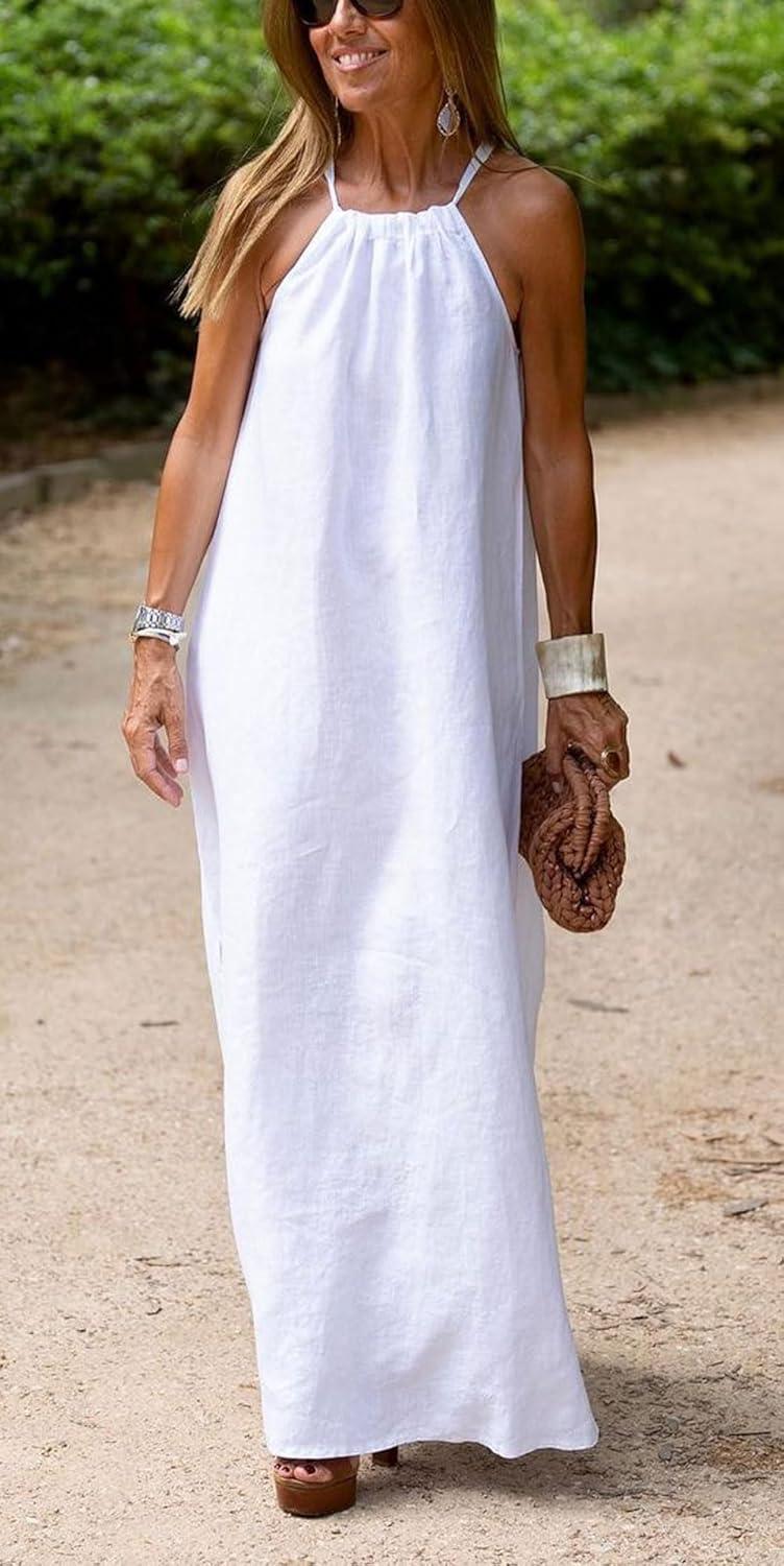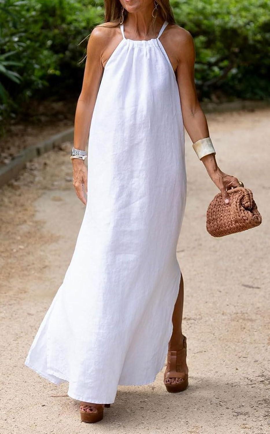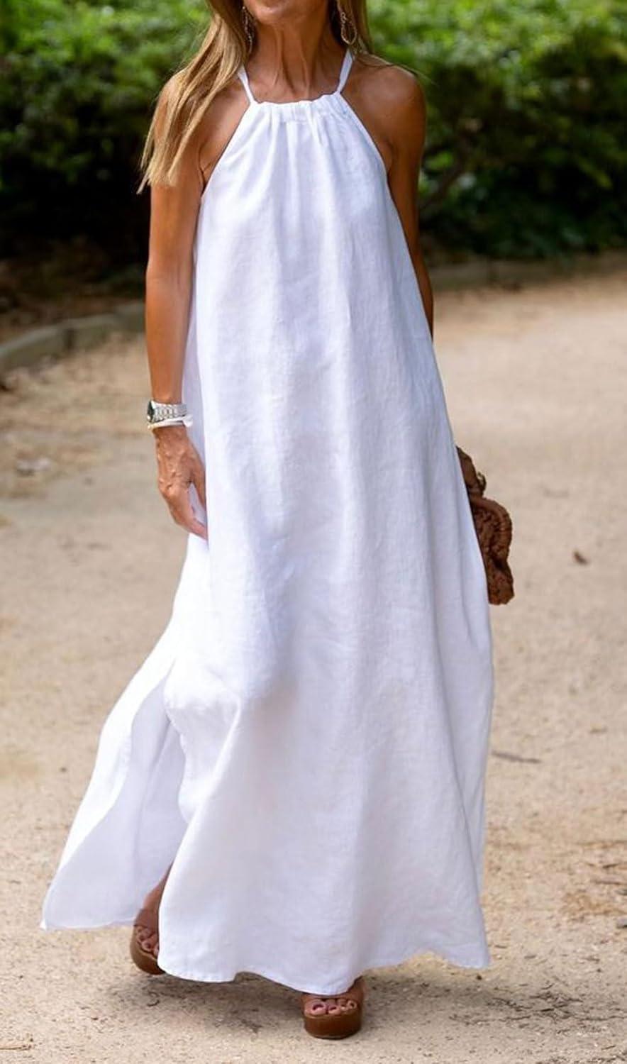 Sexy Halter Neck Long Dress/ Summer Beach Maxi Long Dress/ Casual Loose Split Linen Long Dress