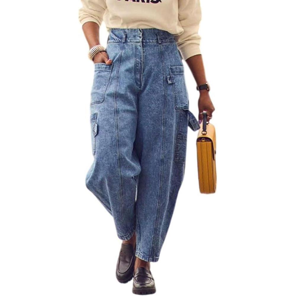 CHARTOU Women High Waist Baggy Jeans Patchwork Plus Size Denim Joggers Cargo Tapered Wide Leg Harem Pants(Blue)