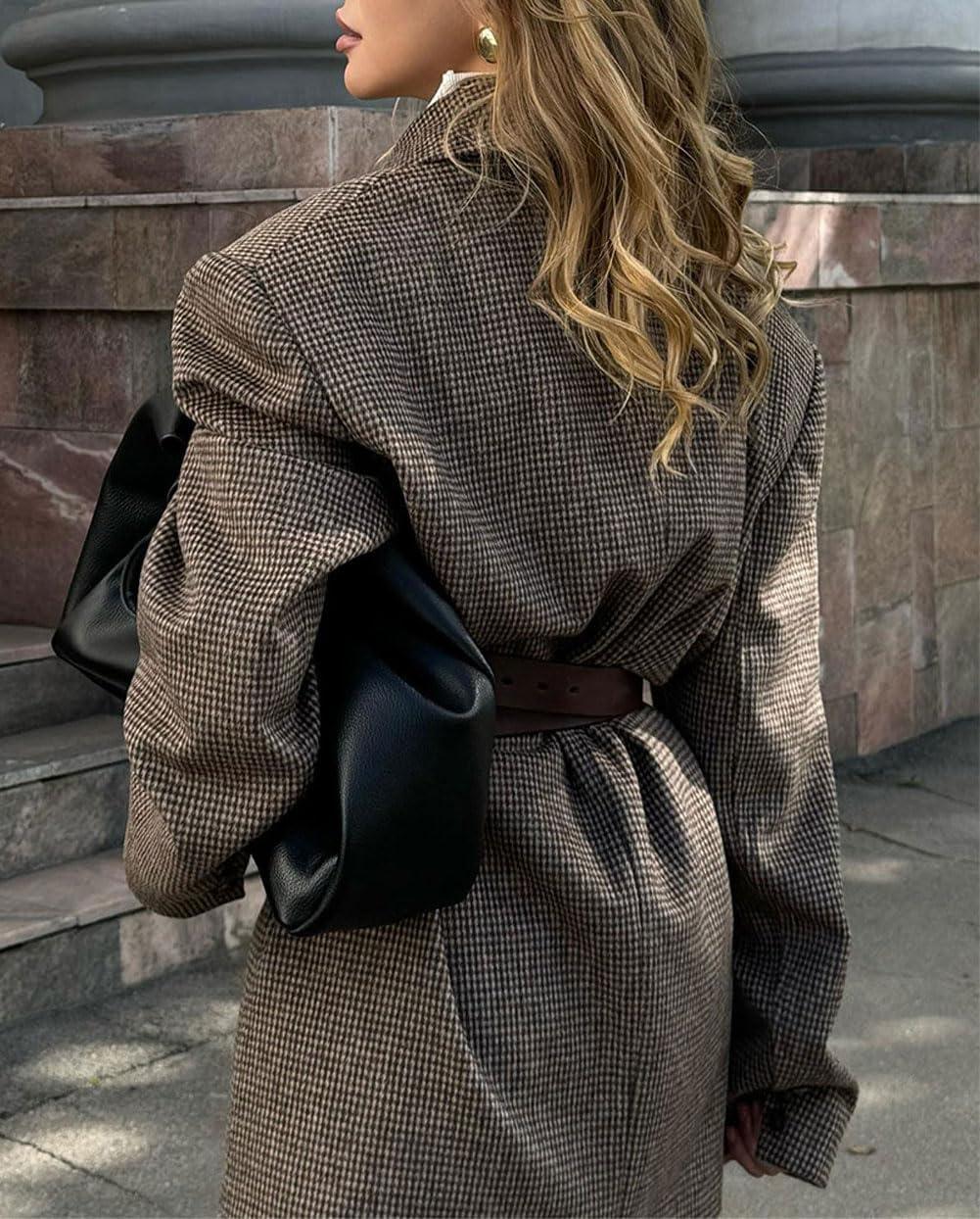 CHARTOU Women Houndstooth Wool Pea Coat/ Notch Lapel Long Sleeve Trench Coat/ Plaid Double Breasted Midi Overcoat
