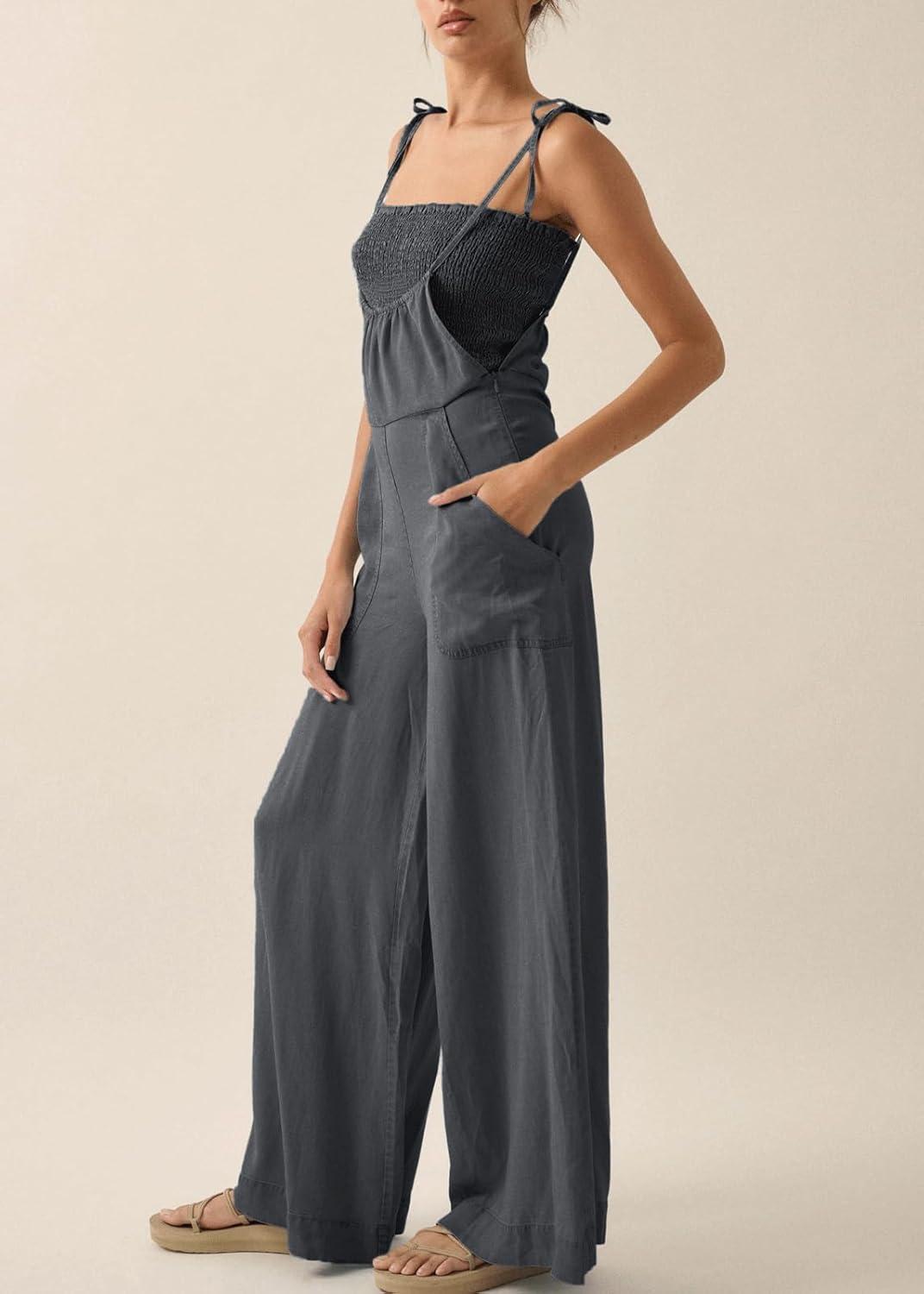 CHARTOU Women Jean Jumpsuit Sets Smocked Tubes Tie Knot Spaghetti Strap Denim Romper Overalls Baggy Pants(Dark Grey)