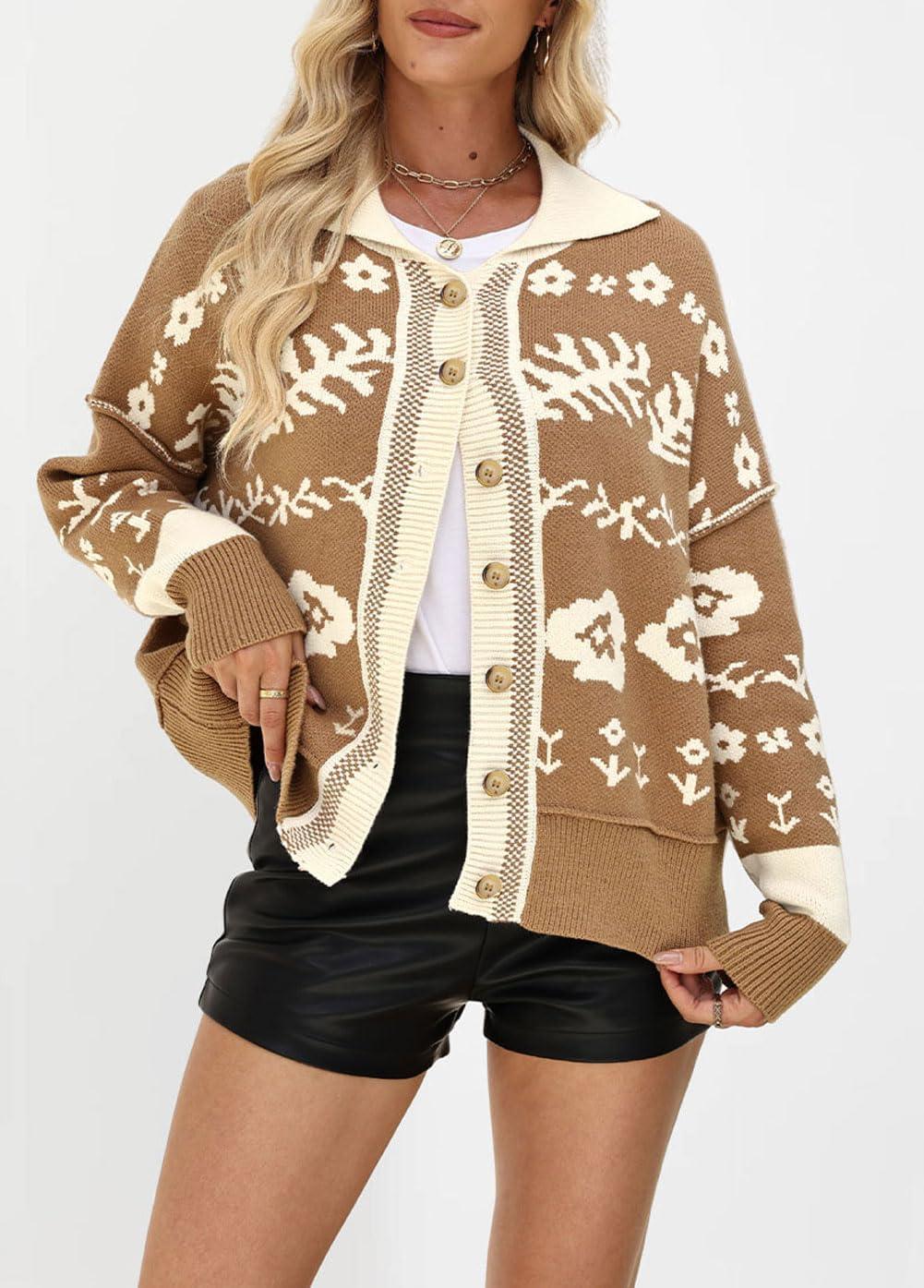 Women Lapel Collar Button Down Sweaters Open Front Cardigans Fall Sweater Coats/ Casual Loose Fit/ Polo Lapel Collar Cardigan Sweaters for Women/ Fall Button Sweater Coats for Women/ Size Tips: S=US 0-2, S=US 4-6, M=US 8-10, L=US 12-14, XL=US 16-18, XXL=US 20-22; Constructed with Soft Sweater Material, This Women Lapel Collar Cardigans Flexibility To Accommodate Various Body Shapes And Sizes, Effortlessly Providing A Flattering Fit/ Polo Collared Sweater Coats: This Fall Women Casual Sweater Coats Featuring Loose-Fitting, Trendy Floral Pattern And Raised Stitching, Easy To Wear With Your Wide Leg Pants, Skirt, Or Layer Over Your Basic Dress/ Design: Front Button Down Cardigans For Women; Comfort Fall Sweater Coats For Women/ Trendy Floral Pattern Sweater Tops For Women/ Turn Down Lapel Collar Sweater Tops/ Moderate Thickness/ Trendy Open Front Cardigan Coats for Women/ Occasion: Polo Collared Cardigan Coats For Women Fall Outfits/ Trendy Floral Pattern Sweater Coats For Women Hanging Out/ Casual Khaki Open Front Sweaters For Women Holiday Outfits/ Warm Fall Winter Sweater Tops For Women/ Slouchy Winter Vacation Sweater Outfits For Women