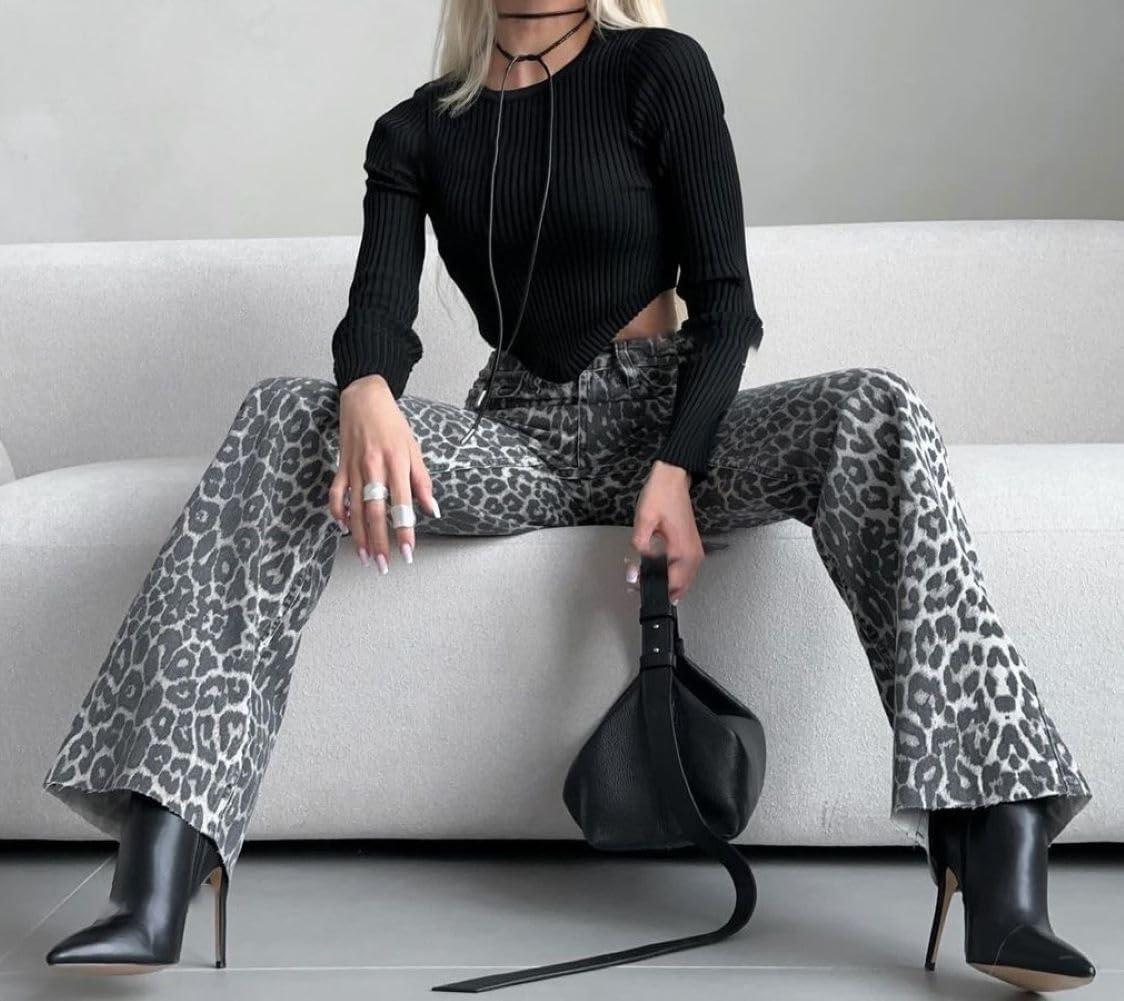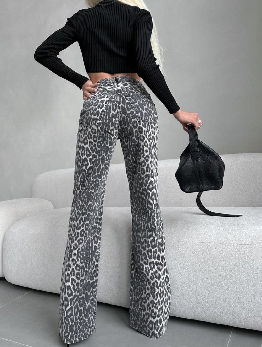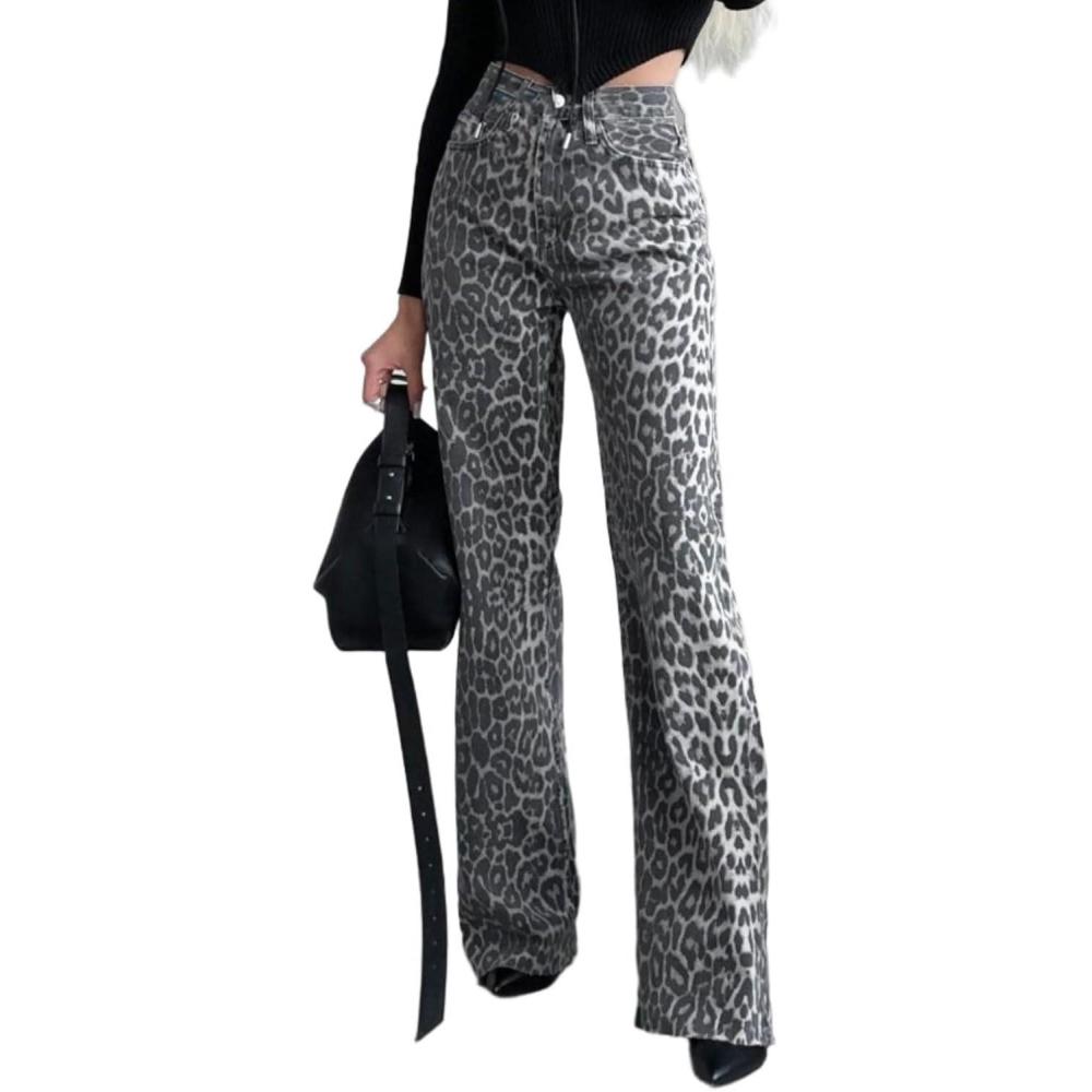Cheetah Straight Denim Pants/ High Waist Wide Leg Jeans/ Baggy Long Pants with Pockets