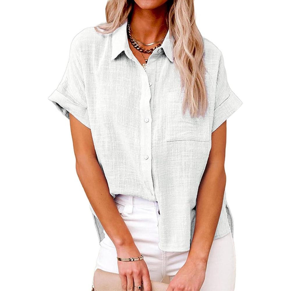 CHARTOU Women Linen Button Down Shirt Lightweight Short Sleeve T Shirt Blouse Summer Top(White)