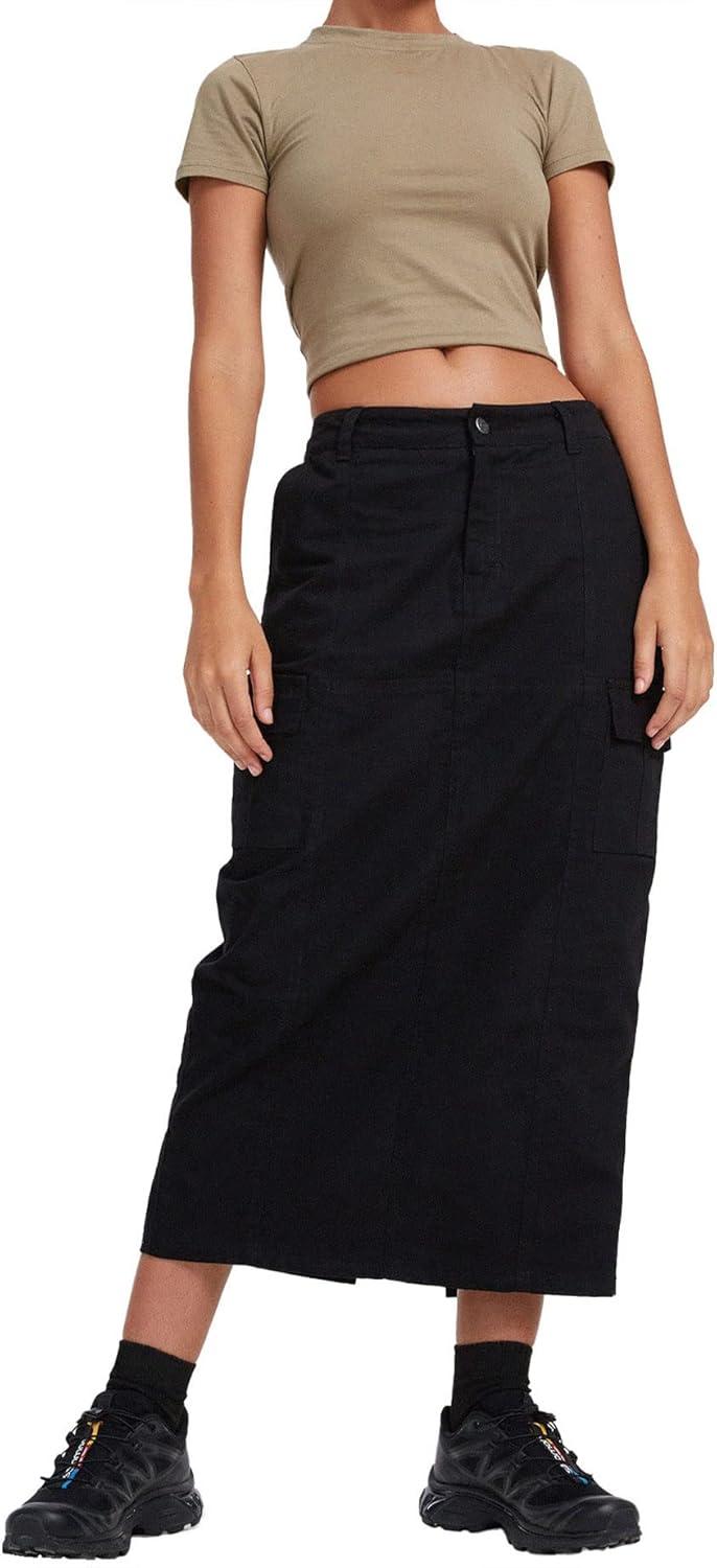 CHARTOU Women Long Denim Jean Skirt Mid Long Cargo Skirt Y2k Casual Denim Pencil Midi Skirt with Pockets(Black)